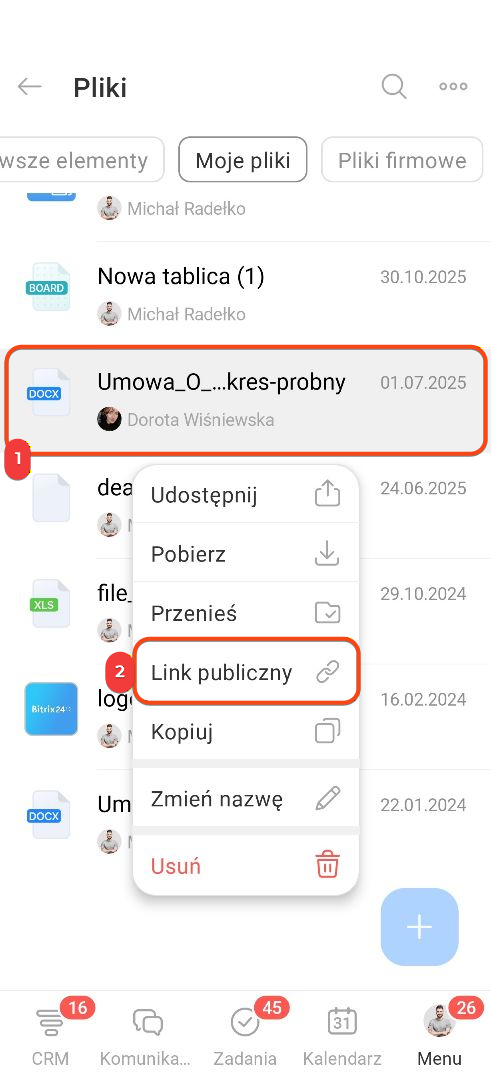 1–3. Wybierz odpowiedni dokument i kliknij Podziel się > Uzyskaj link publiczny.