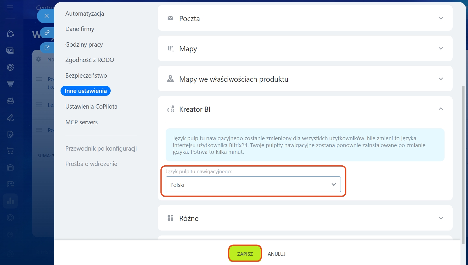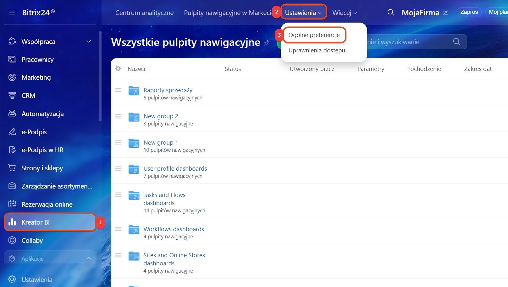 Jak zaktualizować dane w Bitrix24. Przejdź do sekcji Kreator BI > Ustawienia > Ogólne preferencje.