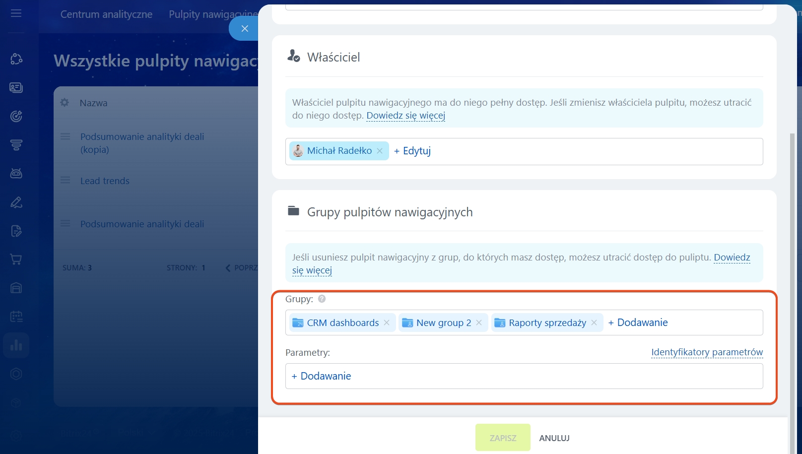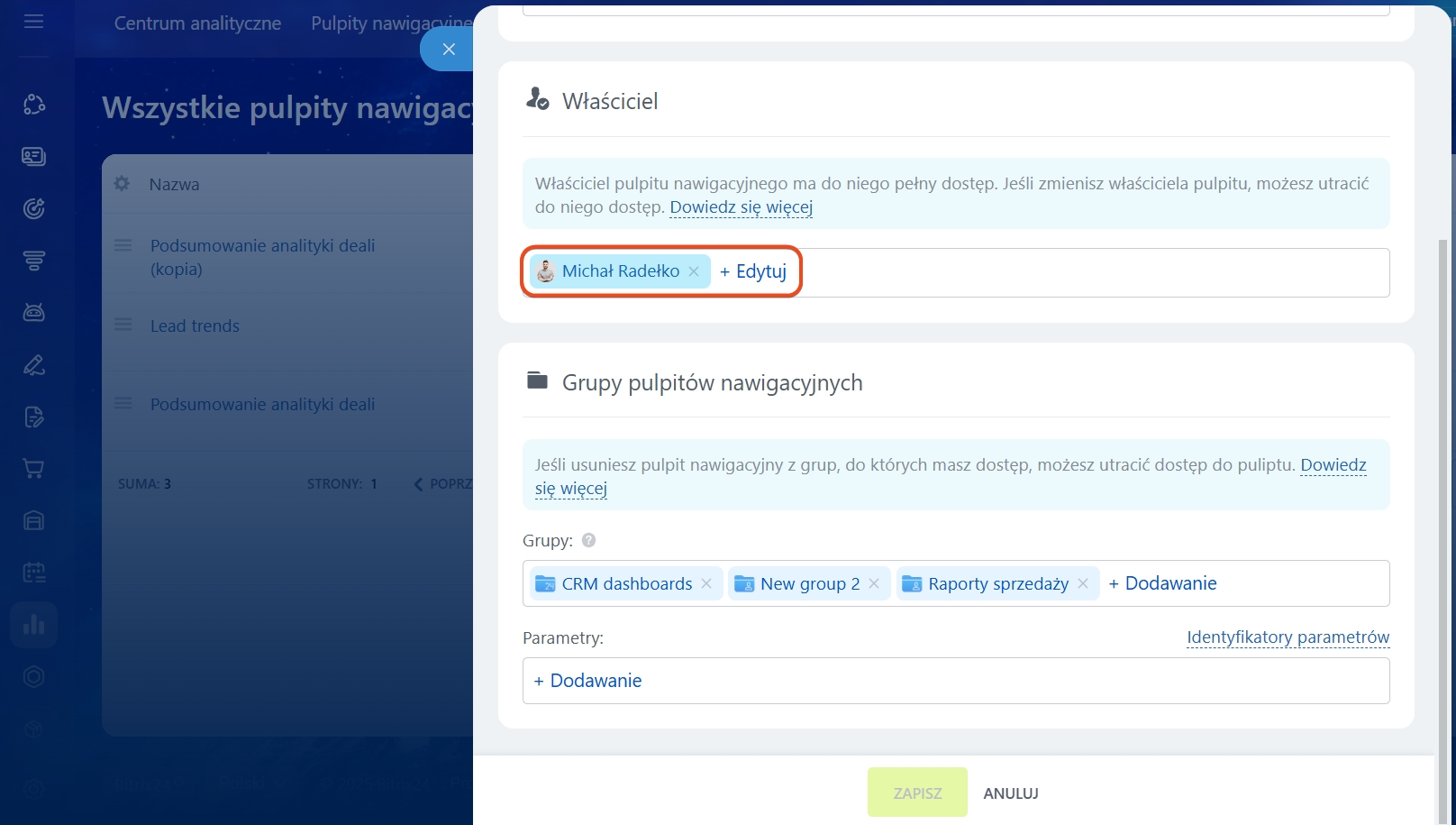 Właściciel. W Bitrix24 twórca raportu automatycznie staje się jego właścicielem. Ma pełny dostęp do raportu, niezależnie od skonfigurowanych uprawnień dostępu w Kreatorze. Czasami raporty są tworzone przez analityka, a inni pracownicy korzystają z nich i aktualizują je. W takim przypadku, aby uprościć dostęp, musisz przypisać nowego właściciela.