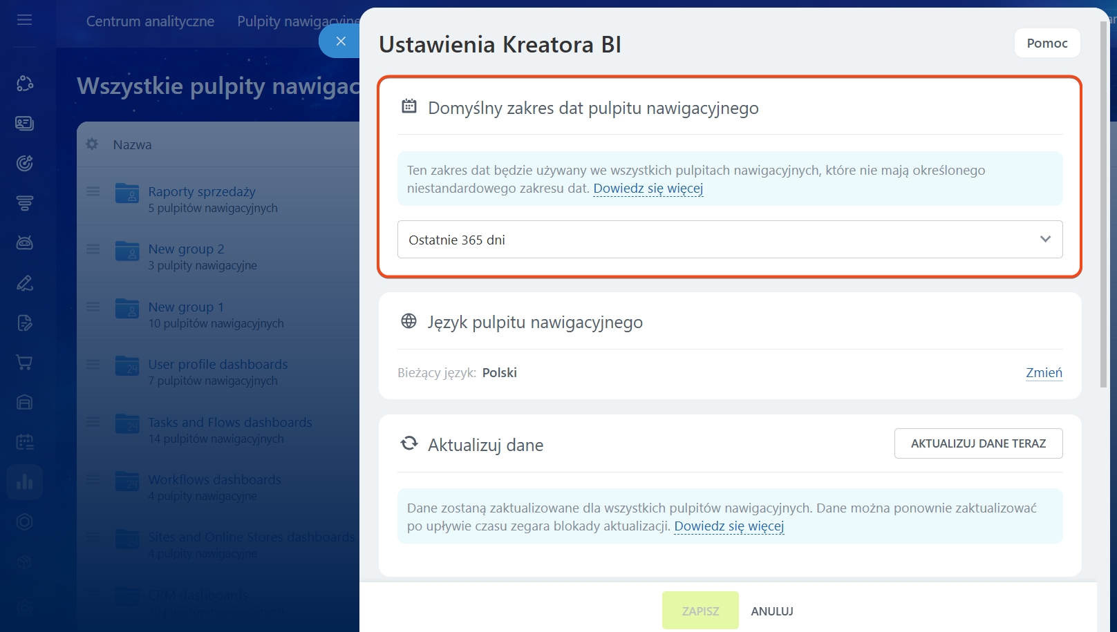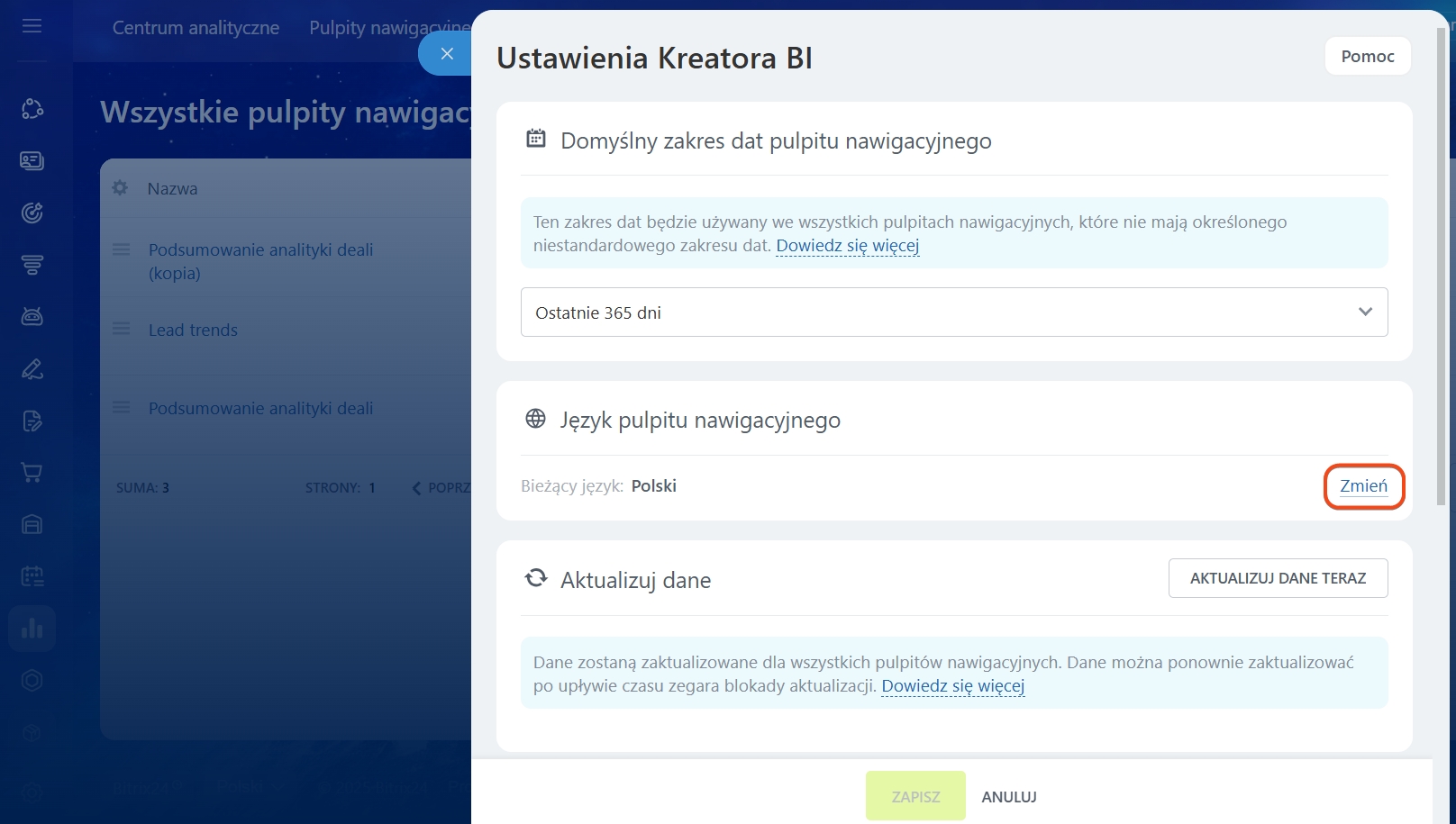 Język raportów. W ustawieniach można wybrać język, w którym będą wyświetlane wskaźniki, podpisy do wykresów oraz elementy interfejsu wewnątrz raportów Kreatora BI. Pomaga to dostosować raporty do zespołu, jeśli pracownicy posługują się różnymi językami. Aby zmienić język, kliknij Zmień, wybierz odpowiedni z listy i zapisz zmiany.