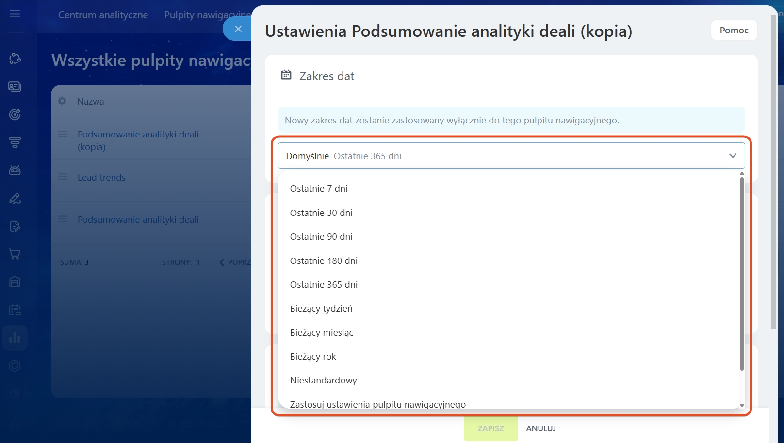 Domyślny zakres dat pulpitu nawigacyjnego. Wybierz okres, za jaki dane będą wyświetlane w raportach. Może to być rok, miesiąc, tydzień lub inny przedział czasu. Jeśli nie wybrano konkretnego zakresu dat, w raporcie zostaną pokazane dane za rok.