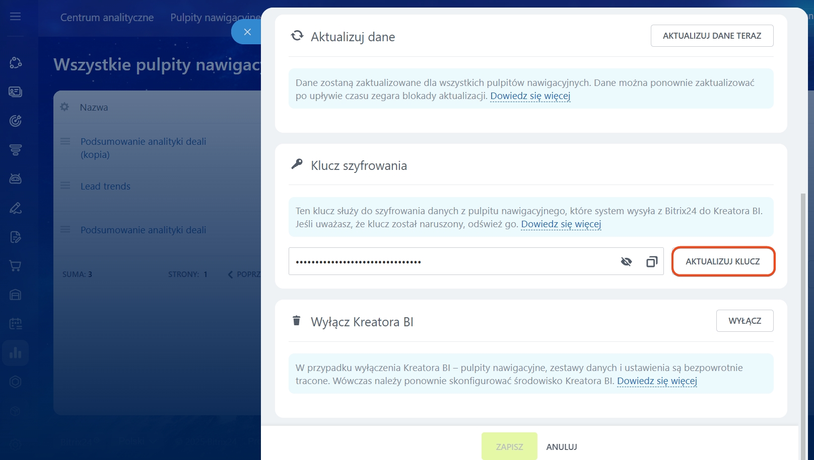 Klucz szyfrowania. Klucz to unikalny identyfikator, który łączy dane z Bitrix24 z Kreatorem BI. Zaktualizuj klucz, jeśli zostanie wykryty przez osoby nieupoważnione.