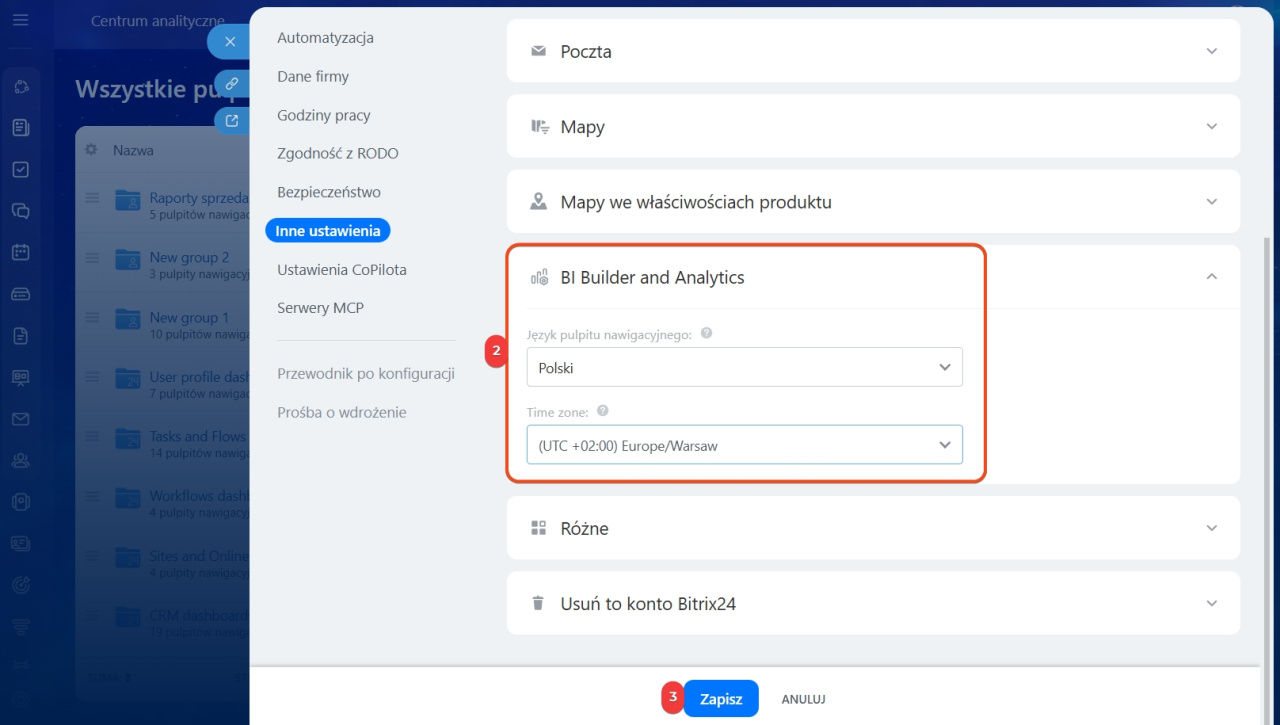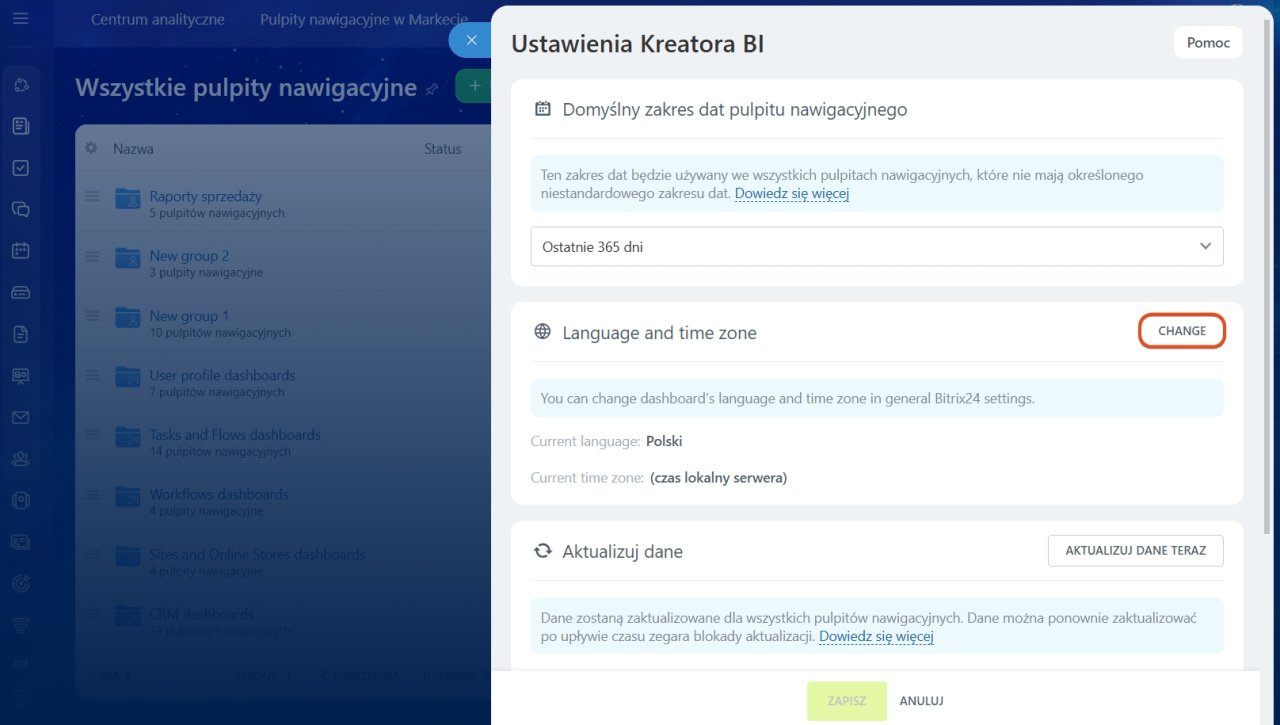 Język raportów określa, w jakim języku będą wyświetlane etykiety, wskaźniki i elementy interfejsu w Kreatorze BI. Strefa czasowa wpływa na sposób prezentowania daty i czasu w analityce.