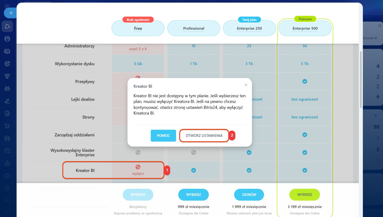 Jeśli chcesz przejść na plan Basic lub Free, musisz ręcznie wyłączyć Kreator BI. Po przejściu na plan Standard możesz nadal korzystać z Kreatora BI, ale nie będziesz mógł konfigurować uprawnień dostępu.