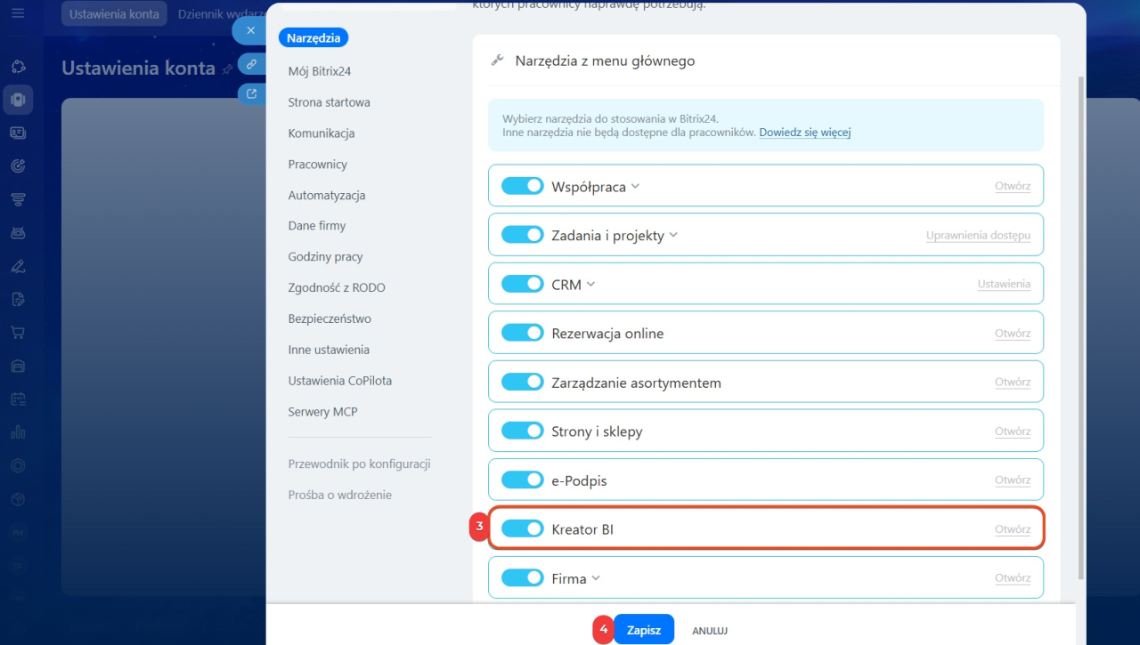 3–4. W ustawieniach Bitrix24 wyłącz Kreator BI i zapisz zmiany.