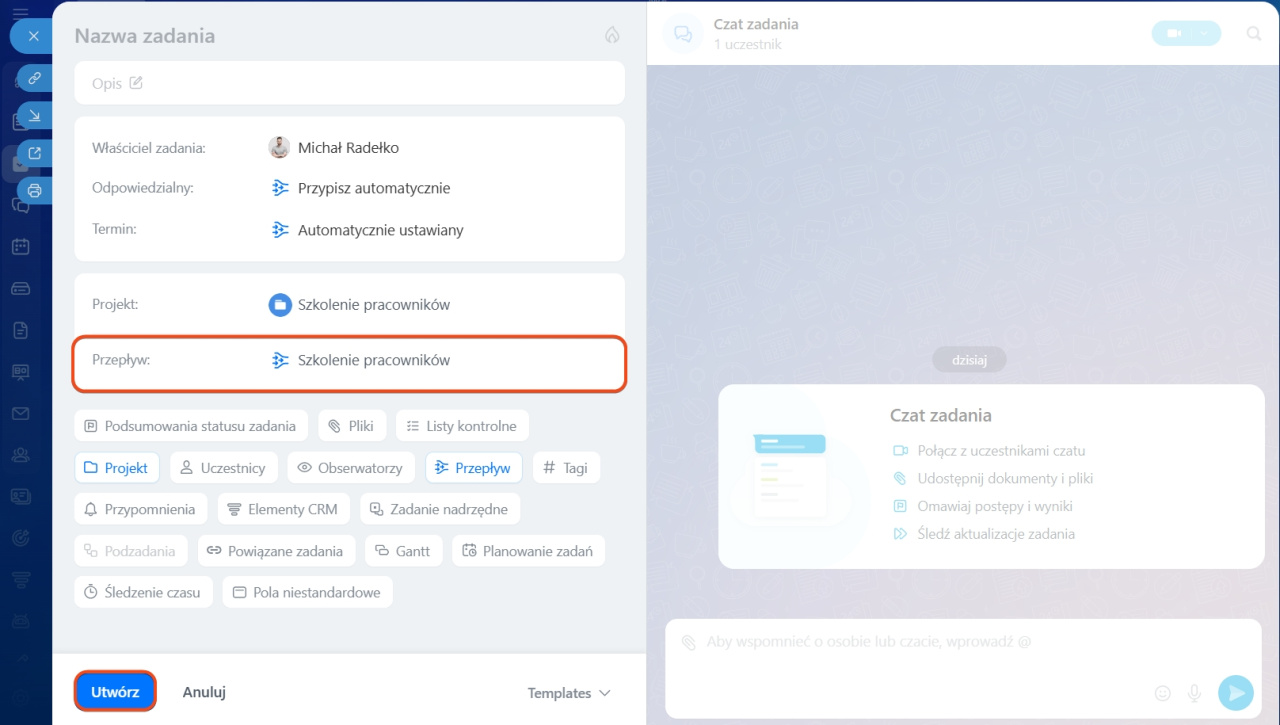 W Przepływie możesz dodać zadanie dla konkretnego działu lub procesu, np. szkolenie nowych pracowników.