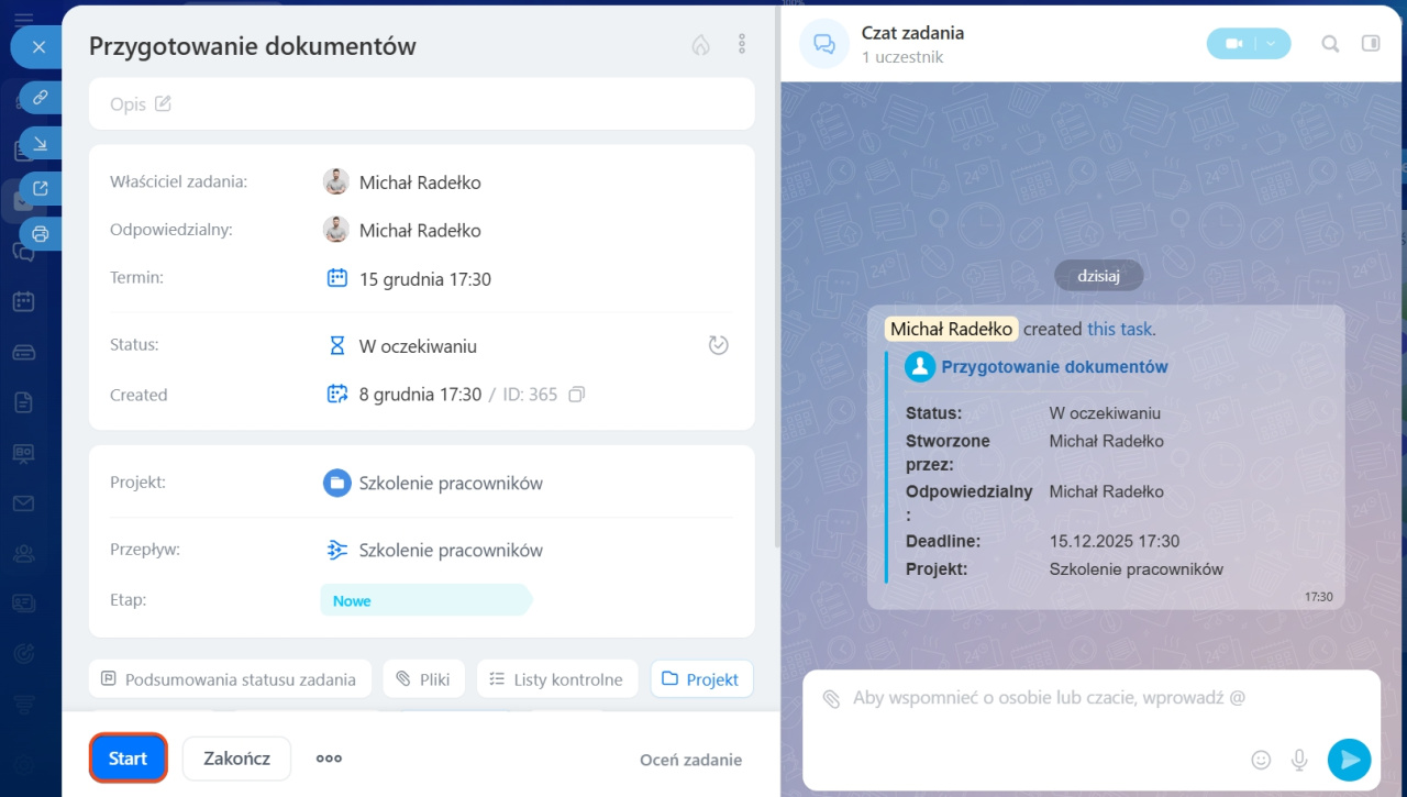 Wpisz nazwę i opis zadania, ustaw dodatkowe ustawienia: przypomnienia, śledzenie czasu i inne. Osoba odpowiedzialna, termin zadania i projekt są dodawane automatycznie. Kliknij Dodaj zadanie.