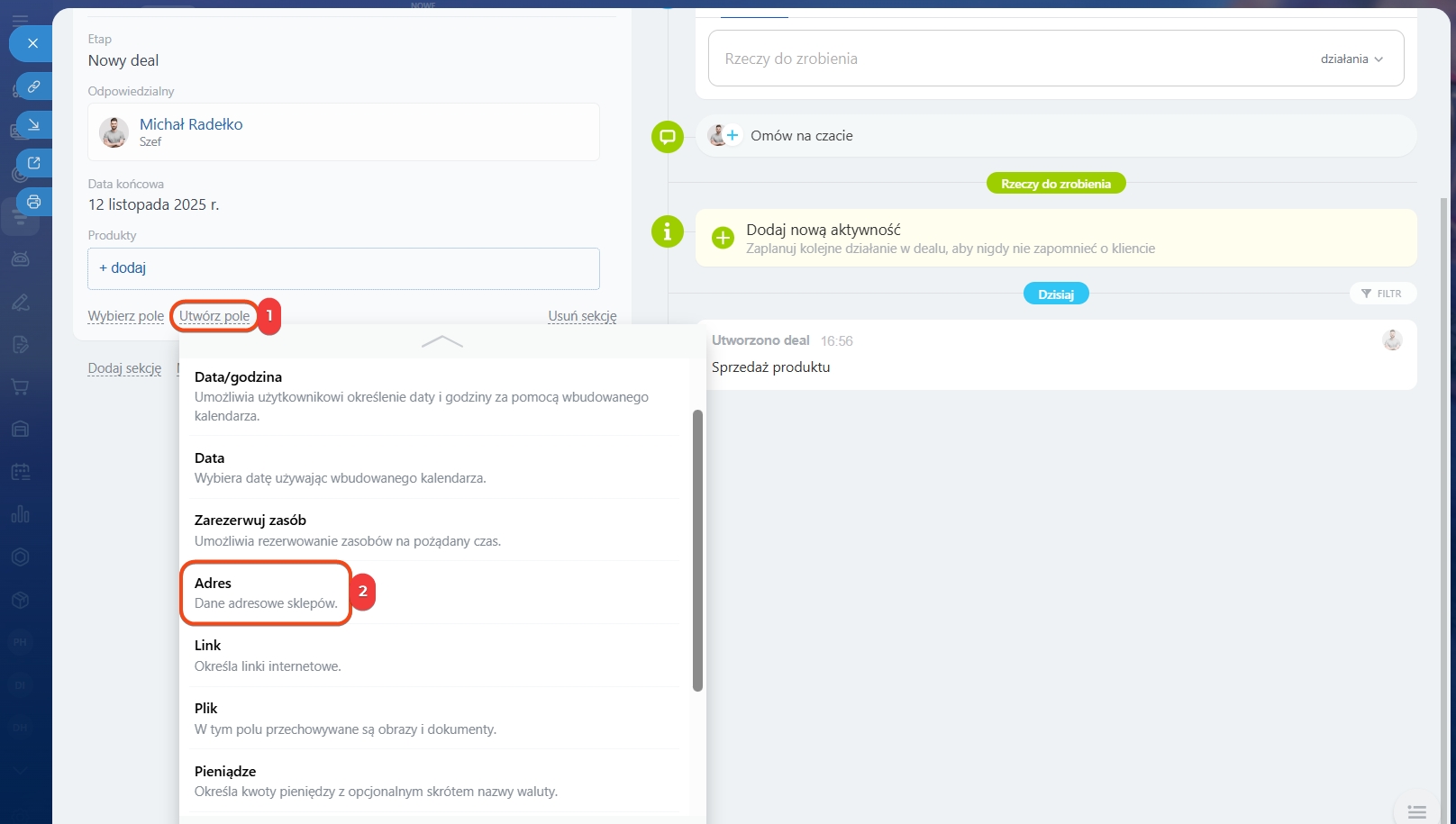 Utwórz pole w ustawieniach CRM. Ten sposób jest odpowiedni, jeśli chcesz utworzyć pole z ustawieniami zaawansowanymi. Na przykład listę z dużą liczbą wartości lub powiązanie z różnymi elementami CRM.