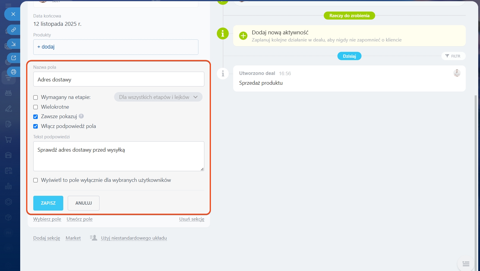 Po skonfigurowaniu ustawień kliknij Zapisz. Pole pojawi się w formularzu elementu CRM.
