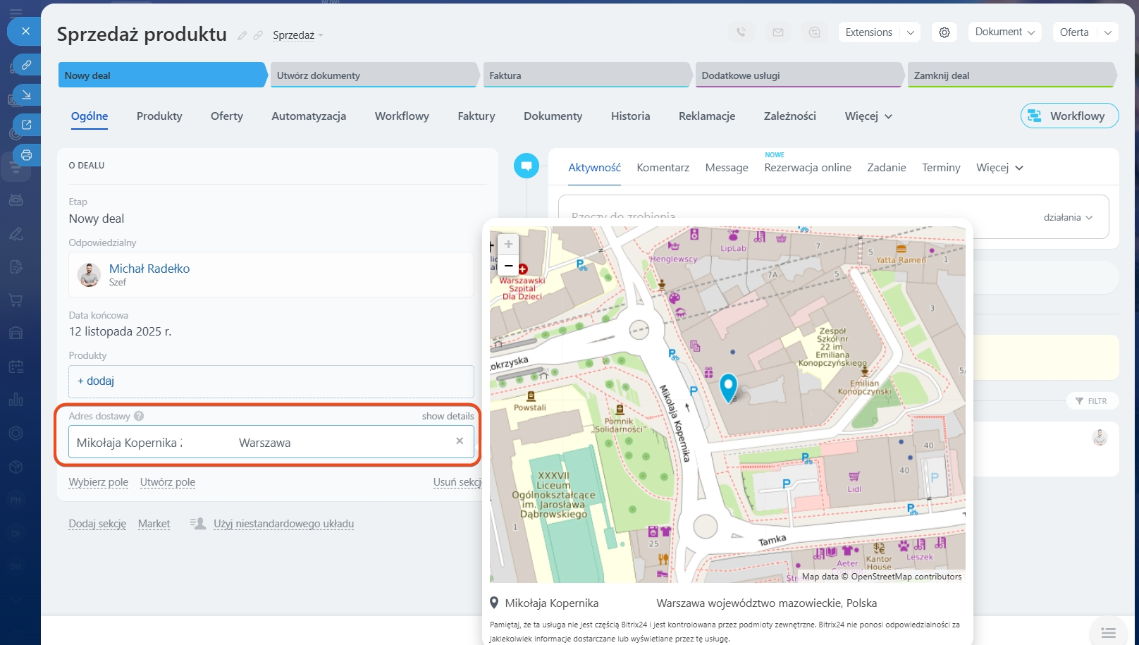 - Adres. Możesz wybrać adres na mapie. Na przykład podaj adres dostawy.