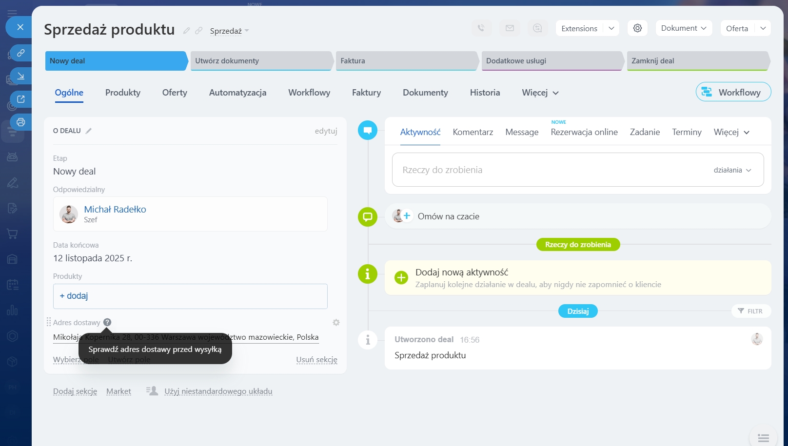 - Wiąż z elementami CRM. Możesz wybrać konkretny element CRM: kontakt, firmę, deal, ofertę.