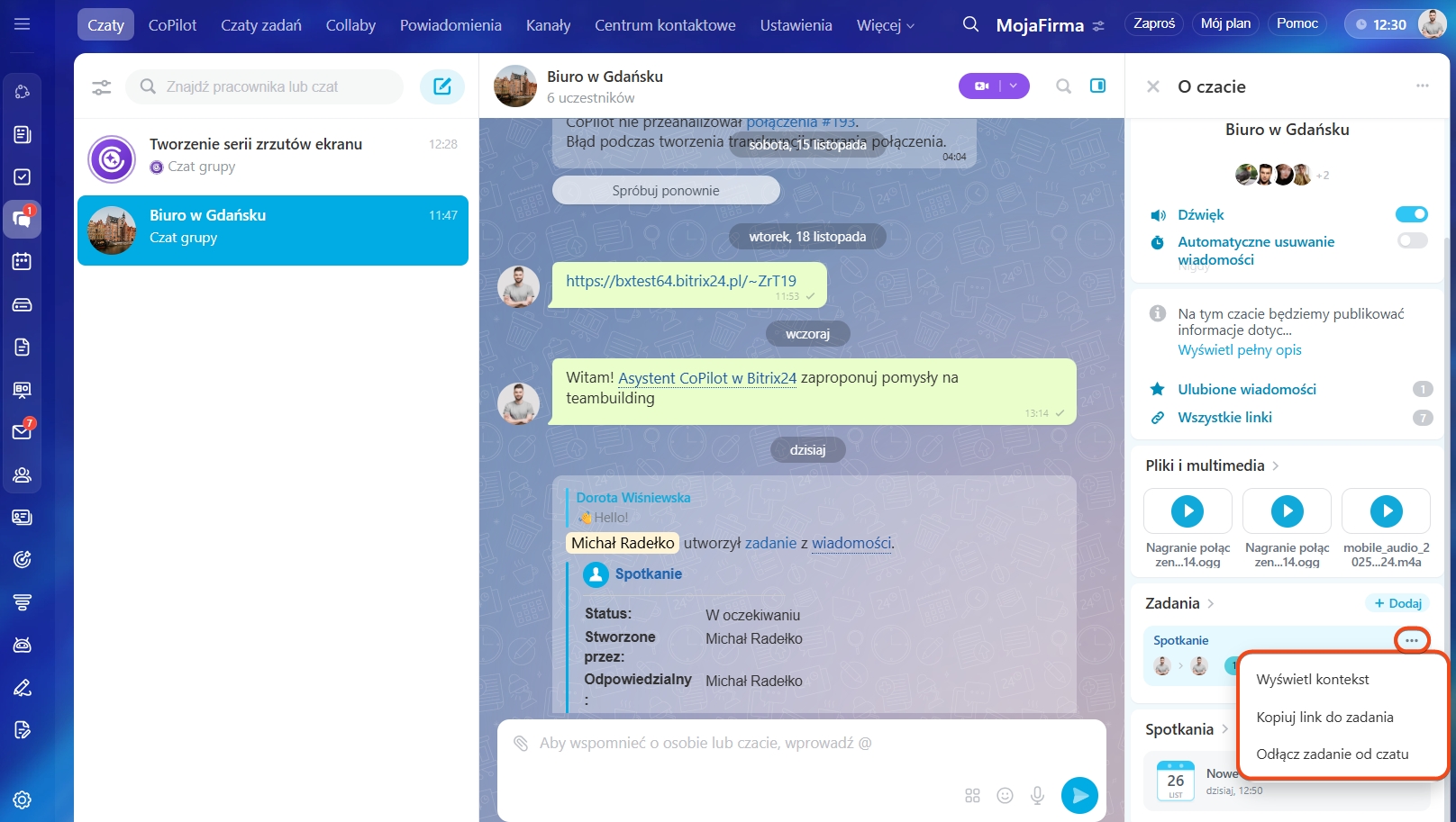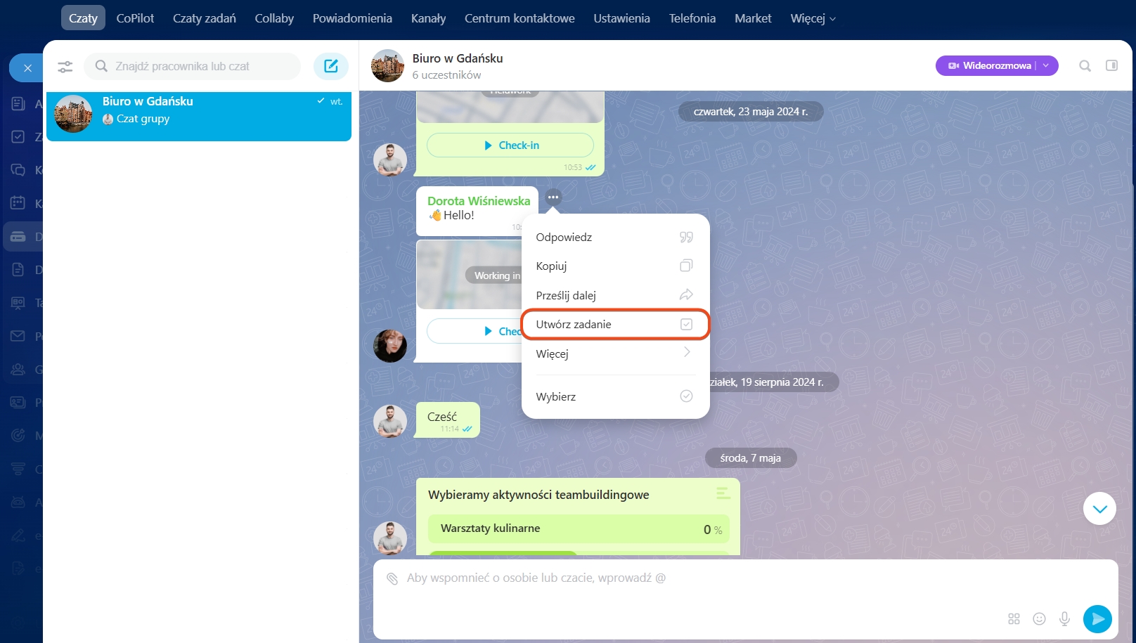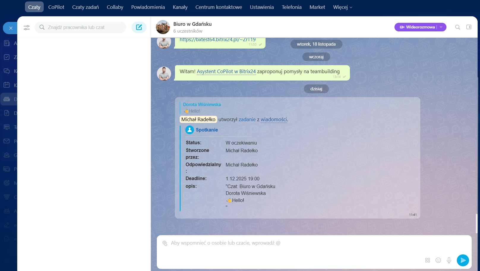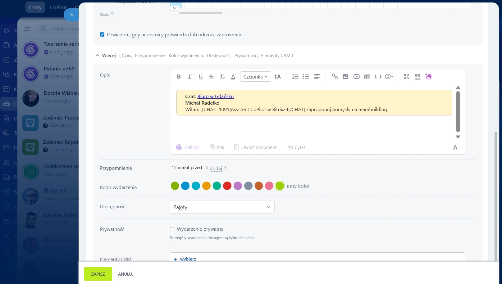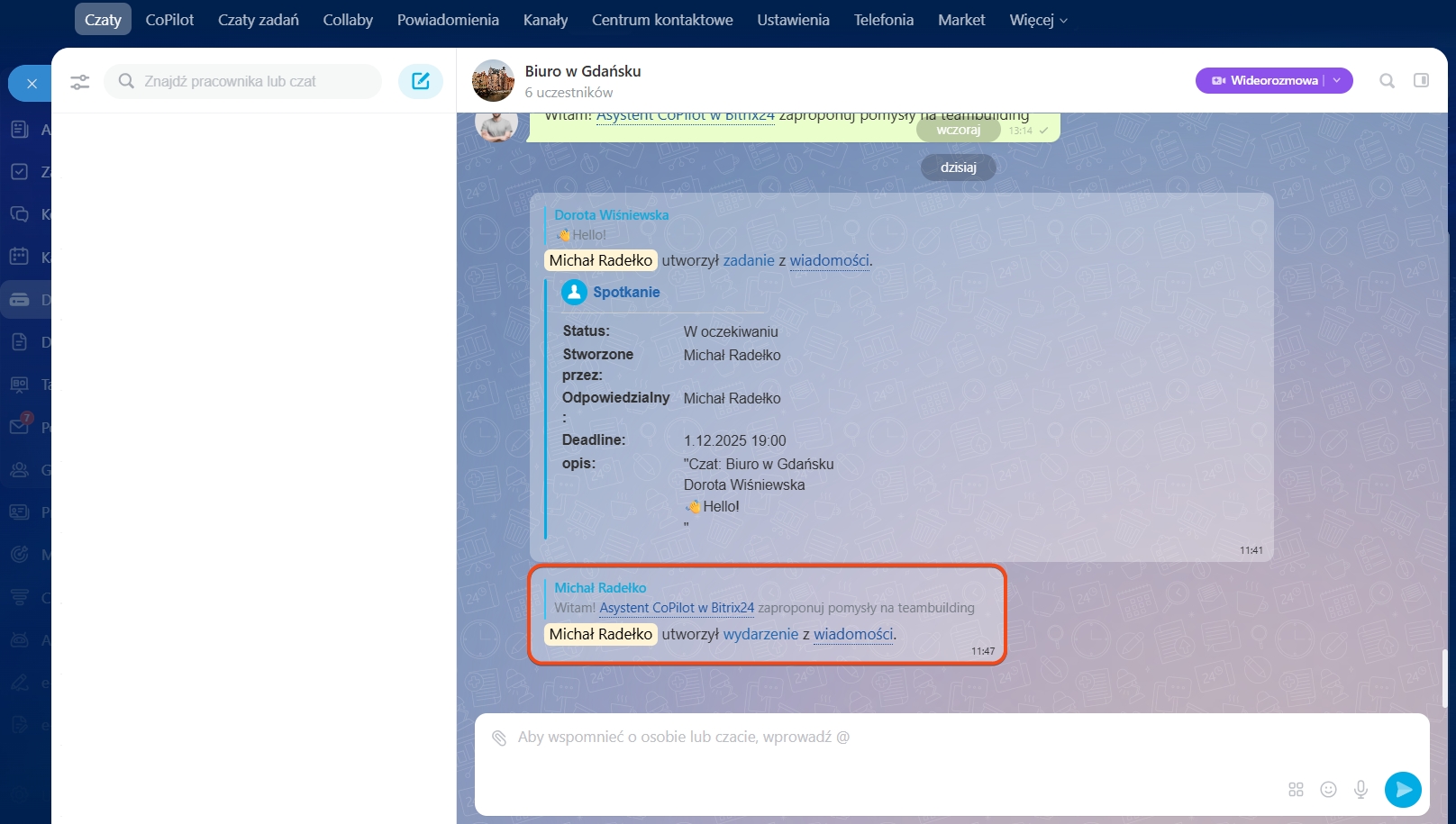 - Wszyscy uczestnicy czatu zostaną automatycznie dodani do zadania lub wydarzenia.