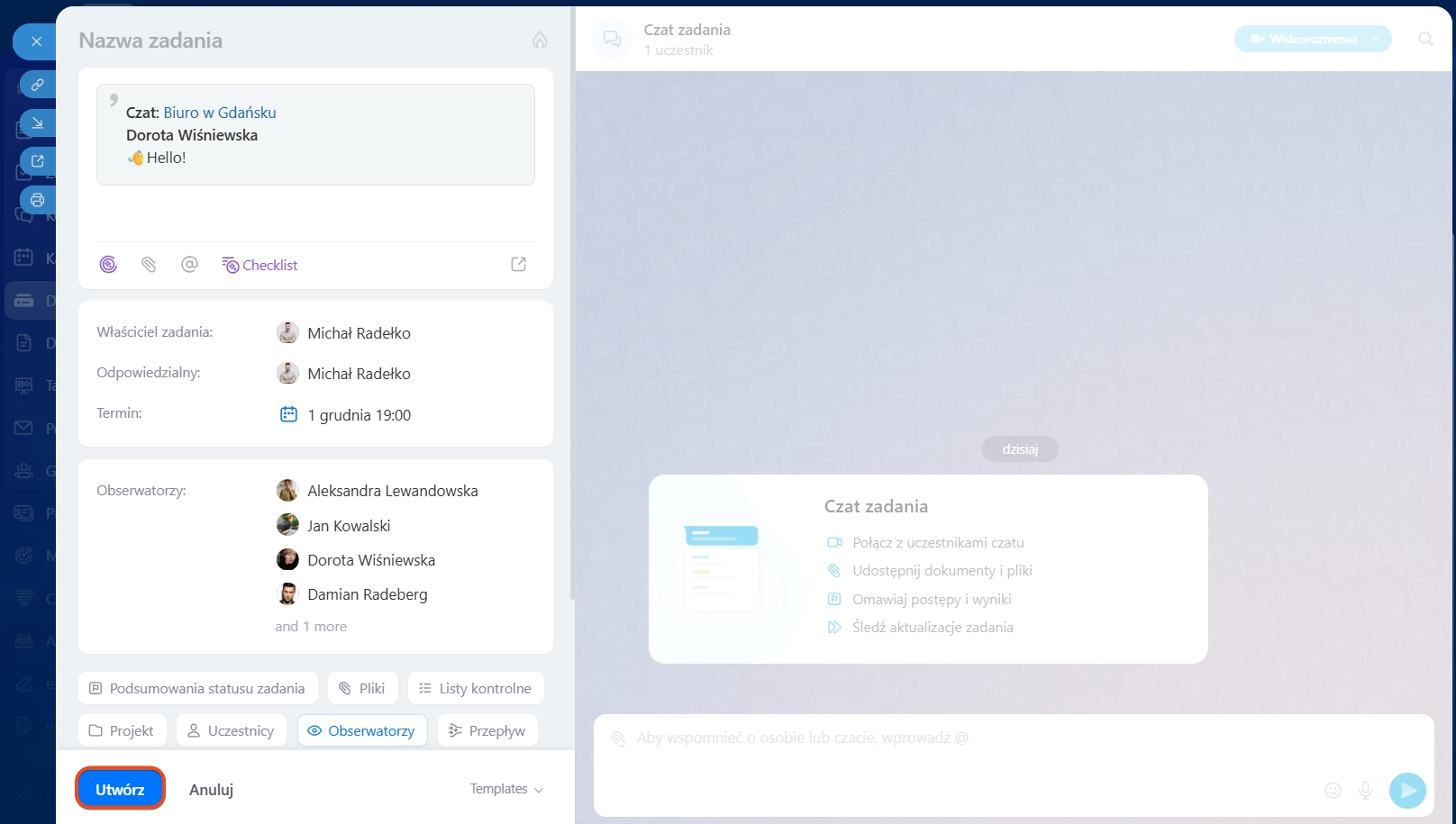 Tworząc zadanie na podstawie wiadomości na czacie osobistym, stajesz się jego twórcą i odpowiedzialnym, a współpracownik staje się obserwatorem. W prywatnym czacie obserwatorem staje się rozmówca, w czacie grupowym obserwatorami będą wszyscy uczestnicy czatu. W kanale obserwatorów należy dodać ręcznie.