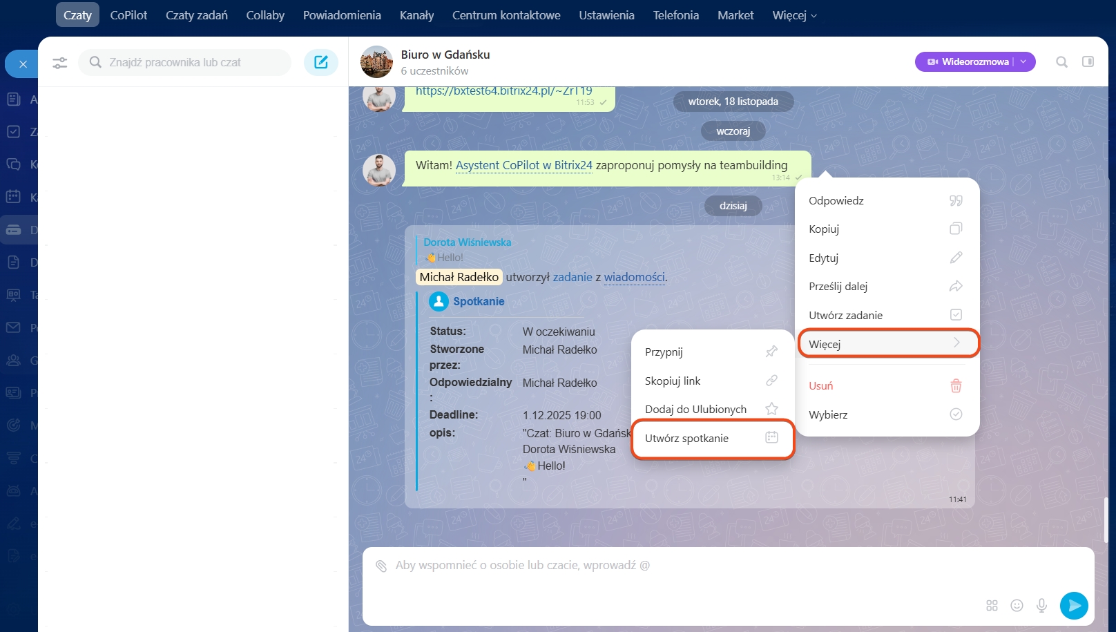 - Możesz natychmiast utworzyć zadanie lub wydarzenie na podstawie ważnej wiadomości na czacie Bitrix24: osobistym lub grupowym.