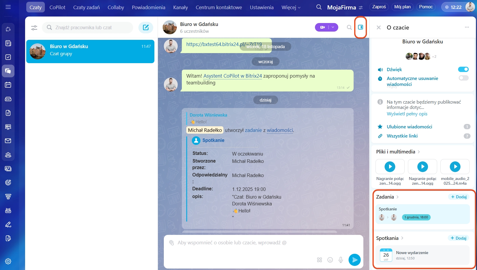 - Aby wyświetlić listę wszystkich wydarzeń i zadań utworzonych na czacie, kliknij Pasek boczny.