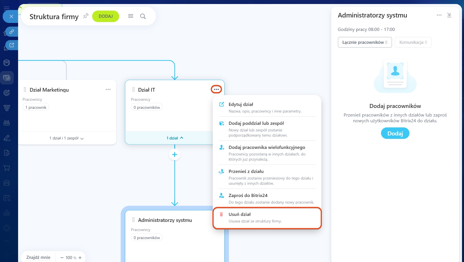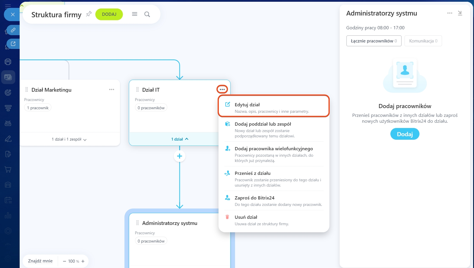 - Działy można edytować: przemieszczać w strukturze, zmieniać nazwę i opis, dodawać nowych pracowników. Jeśli dział nie jest już potrzebny, usuń go ze struktury.