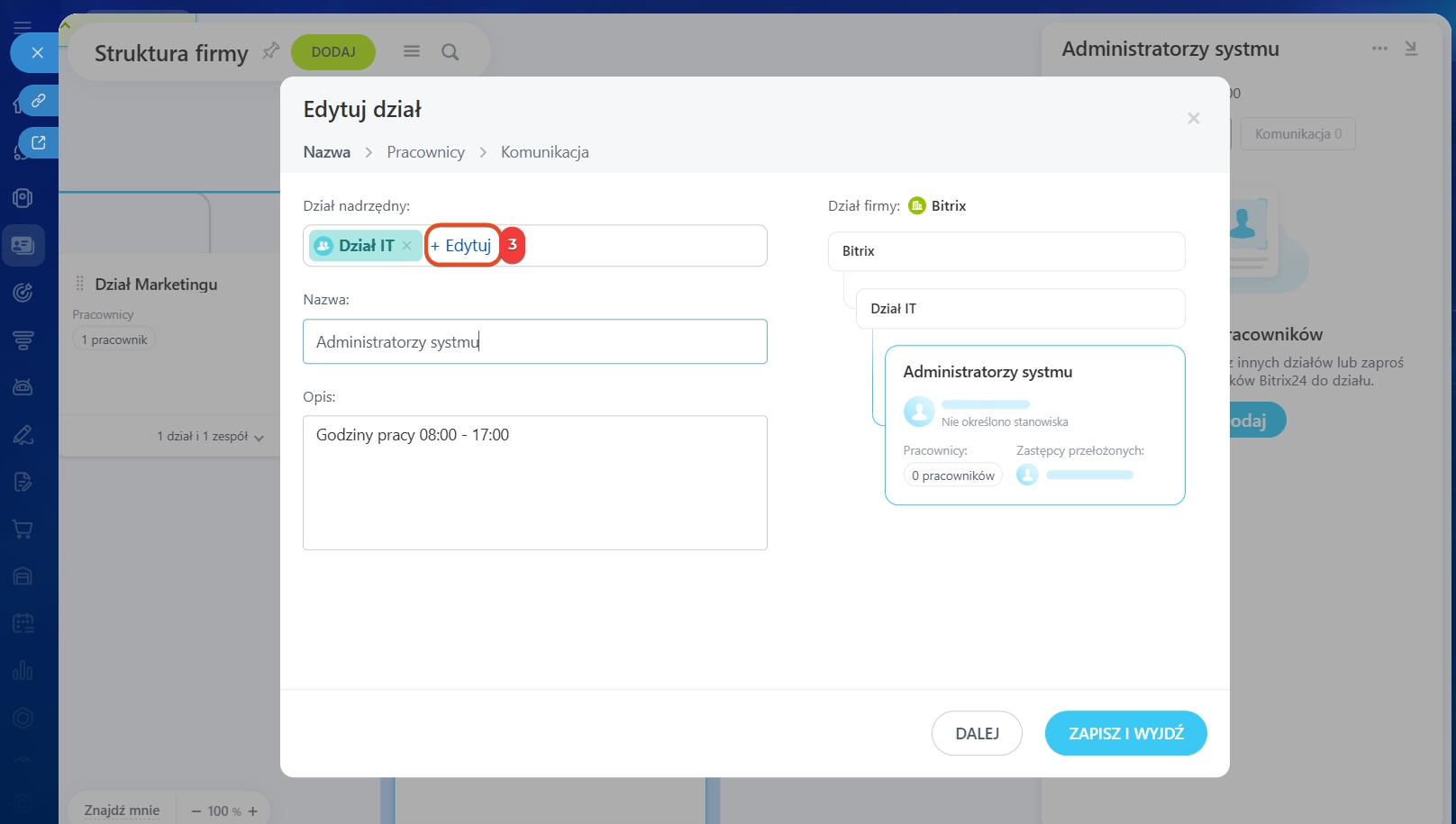 W prawej części okna ustawień można zobaczyć, jak dział będzie wyświetlany w strukturze firmy.