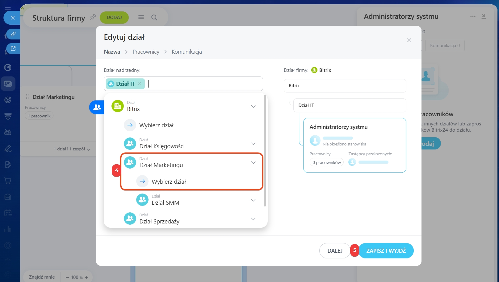 - Podwładni — wybierz pracowników, którzy pracują w tym dziale.