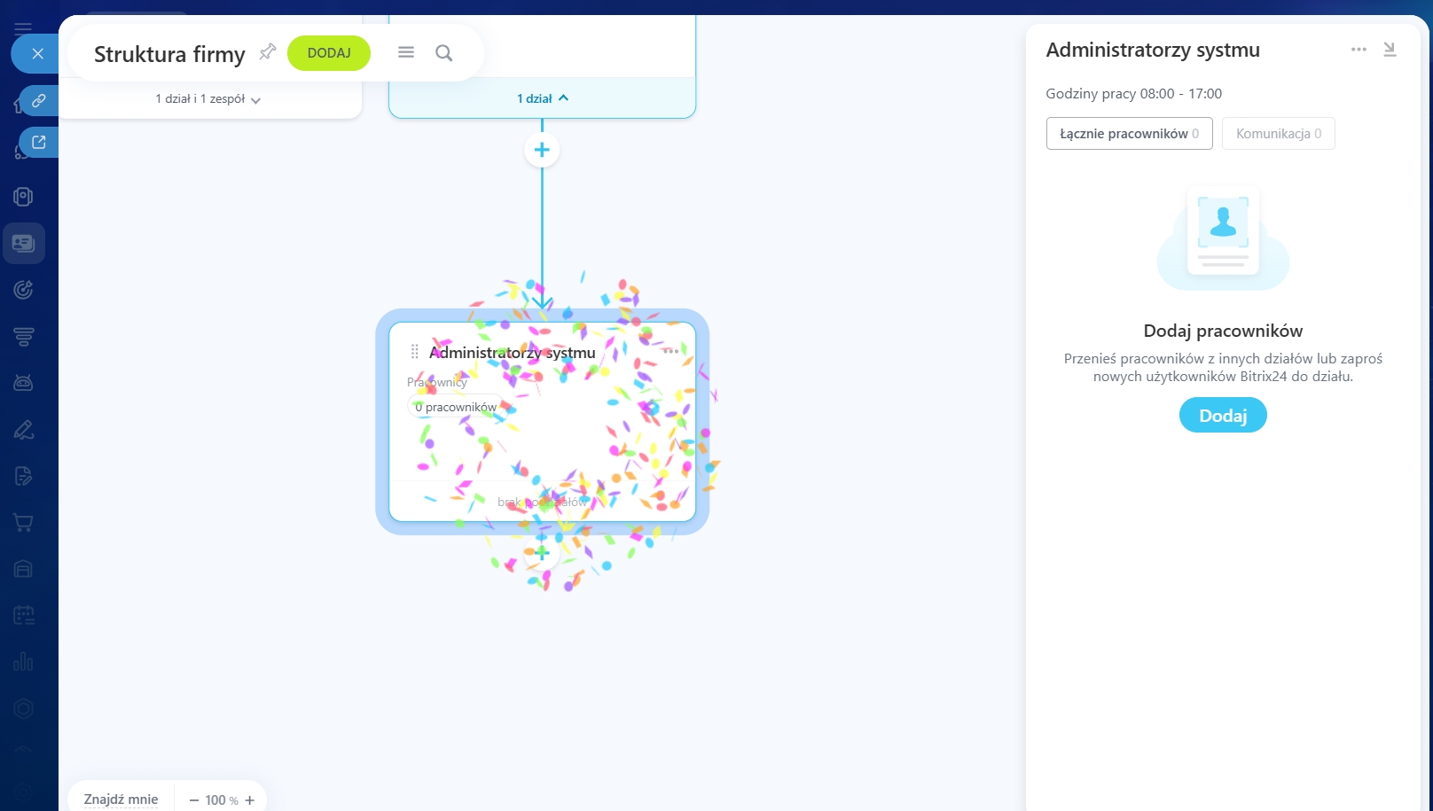 - Struktura firmy składa się z działów. Możesz tworzyć nowe działy lub edytować istniejące.