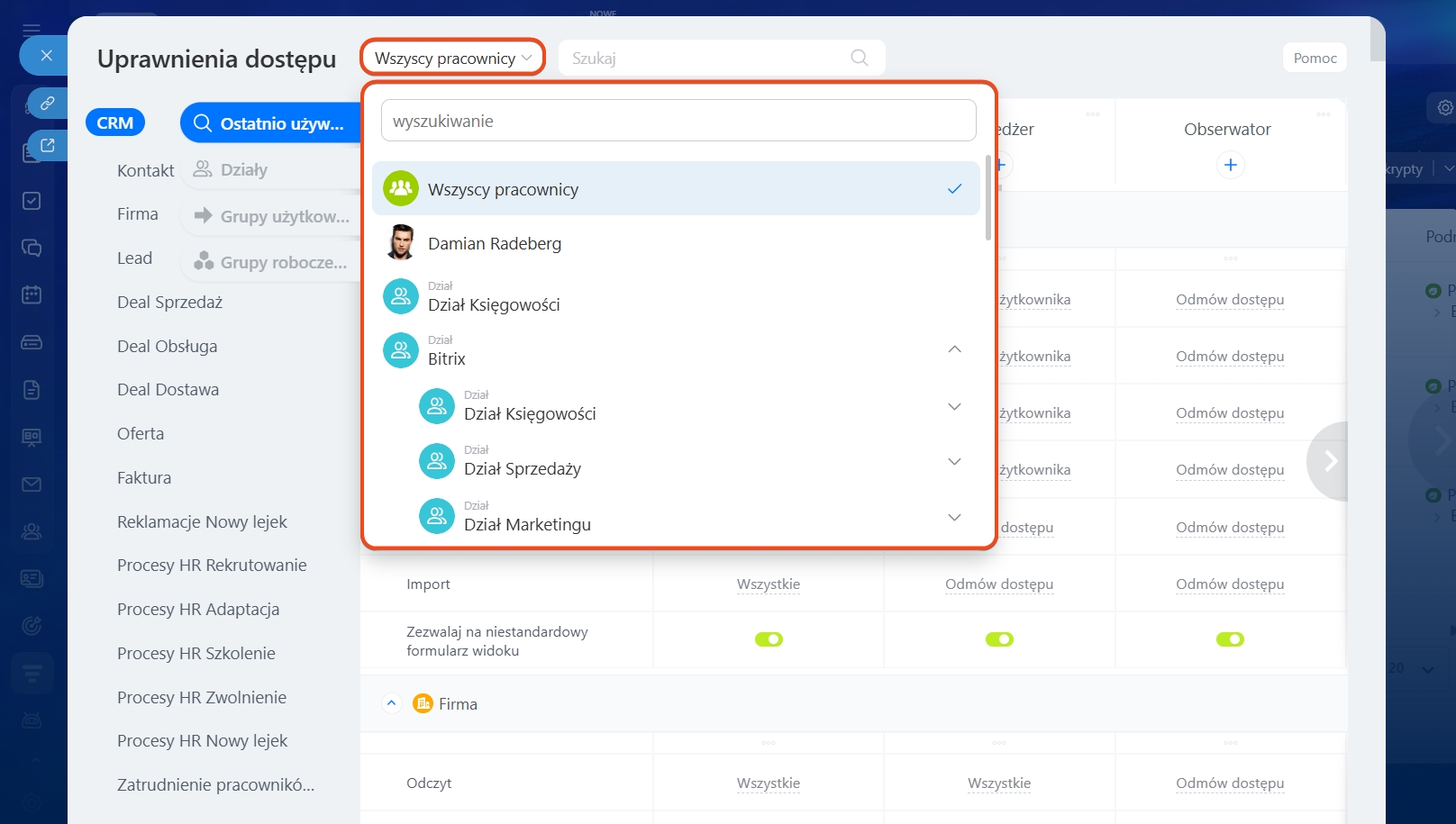 - Elementy działu użytkownika: pozwala użytkownikom na dostęp do elementów pracowników ich działu.