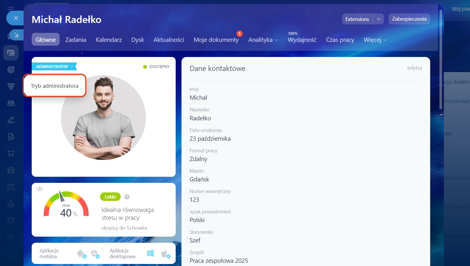 Otwórz swój profil, kliknij Administrator > Tryb administratora.