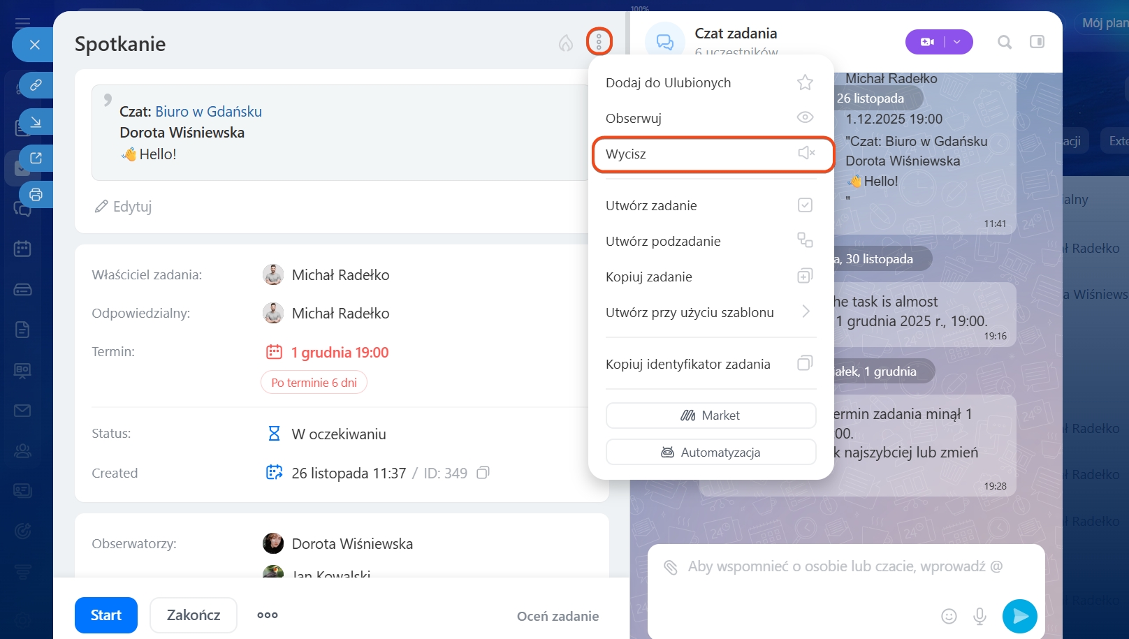 Powiadomienia dla obserwatorów w zadaniach są domyślnie wyłączone — nazywa się to trybem „Bez dźwięku”. W tym trybie obserwatorzy nie otrzymują powiadomień, ale widzą szary licznik nieprzeczytanych wiadomości. Ma to na celu uniknięcie rozpraszania pracowników: nie uczestniczą oni bezpośrednio w pracy, ale mogą w każdej chwili otworzyć zadanie i sprawdzić postęp.