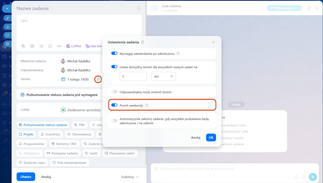 W przypadku zadań powtarzalnych termin ostateczny obliczany jest od daty utworzenia zadania. Jeśli w szablonie włączono opcję Pomiń weekendy i dni wolne, data zakończenia będzie uwzględniać godziny pracy określone w ustawieniach Bitrix24.