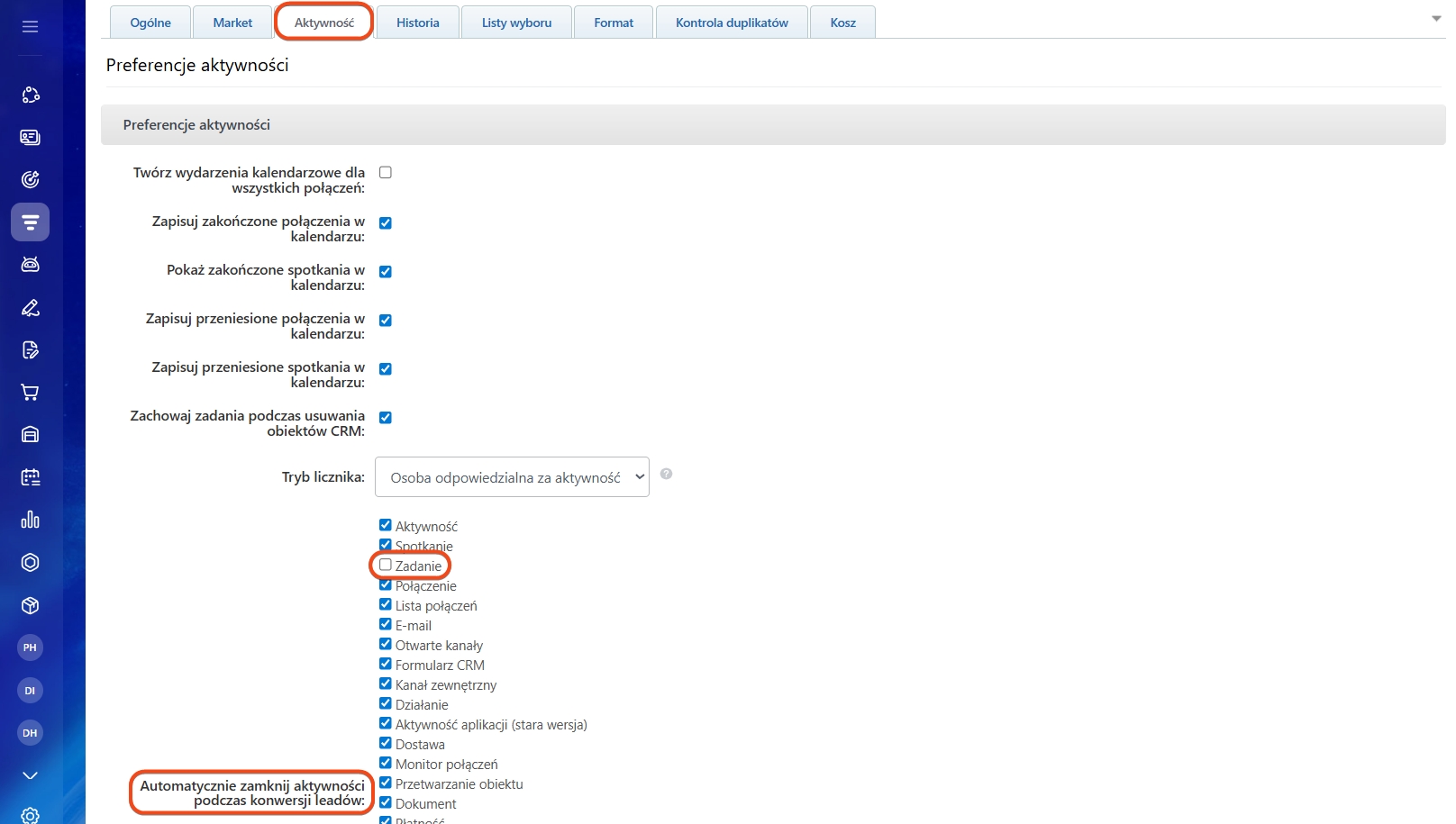 7-9. Otwórz zakładkę Aktywności > Automatycznie zamknij aktywności podczas konwersji leadów, odznacz pole przy elemencie Zadanie.