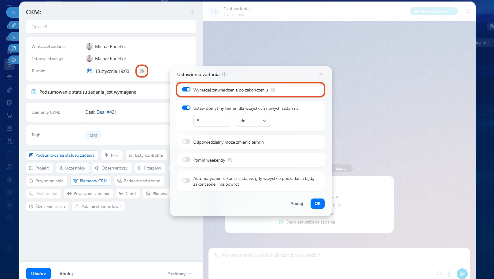 - Jeśli zamkniesz lead lub deal, to niezakończone zadania automatycznie otrzymają status Zakończona.