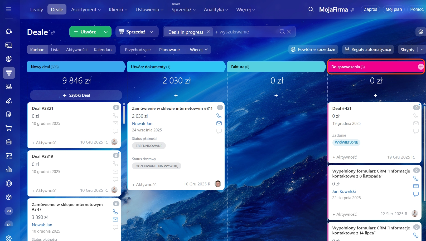 - Jeśli deal ma kilka zadań, w kanbanie wyświetlany jest ostatnio zaktualizowany status.