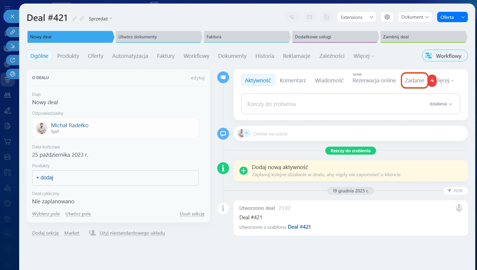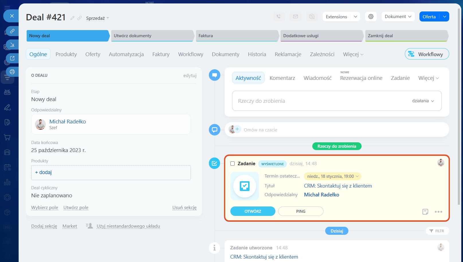 Możesz tworzyć zadania powiązane z klientami bezpośrednio w formularzu elementu CRM. Na przykład, przygotuj umowę lub wyślij ofertę handlową dotyczącą deala. Statusy zadań pomogą śledzić proces ich realizacji.