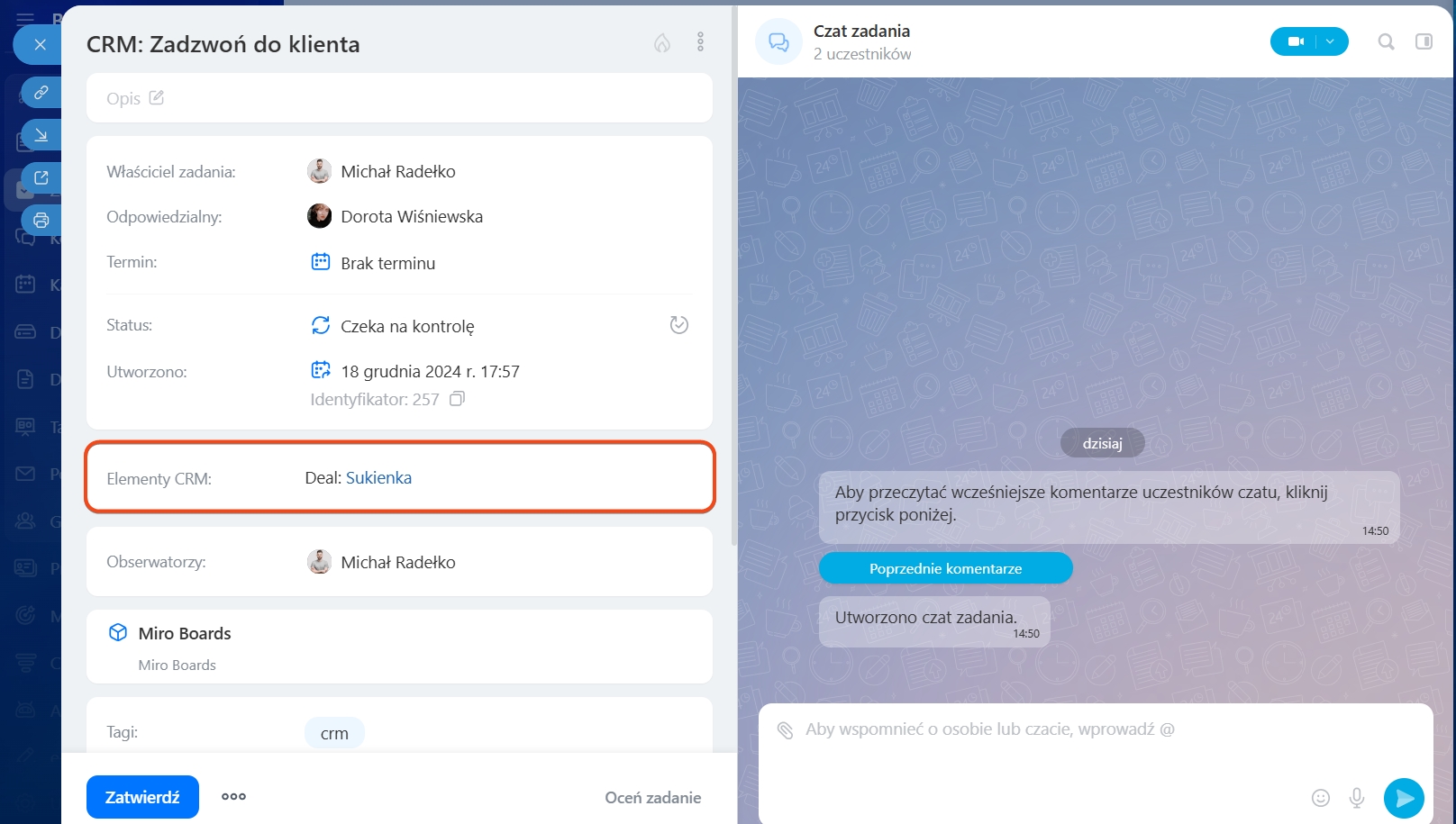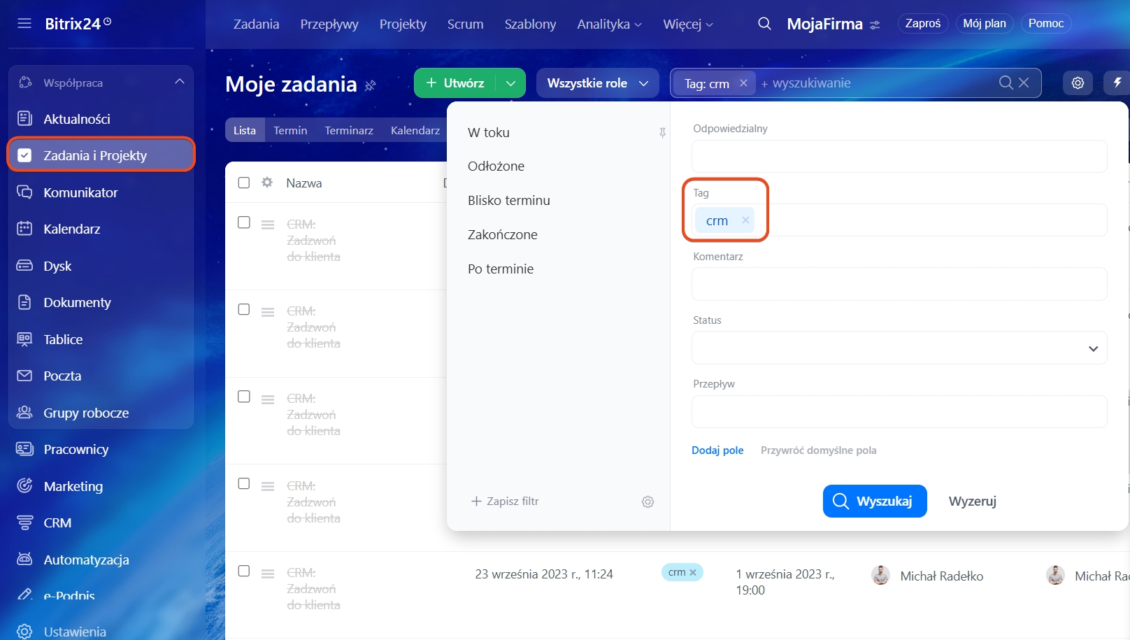 Zadania utworzone w CRM można również znaleźć w sekcji Zadania i projekty. Aby to zrobić, skonfiguruj filtr według pola Tag > CRM. W takich zadaniach wyświetlane są linki do powiązanych elementów CRM.