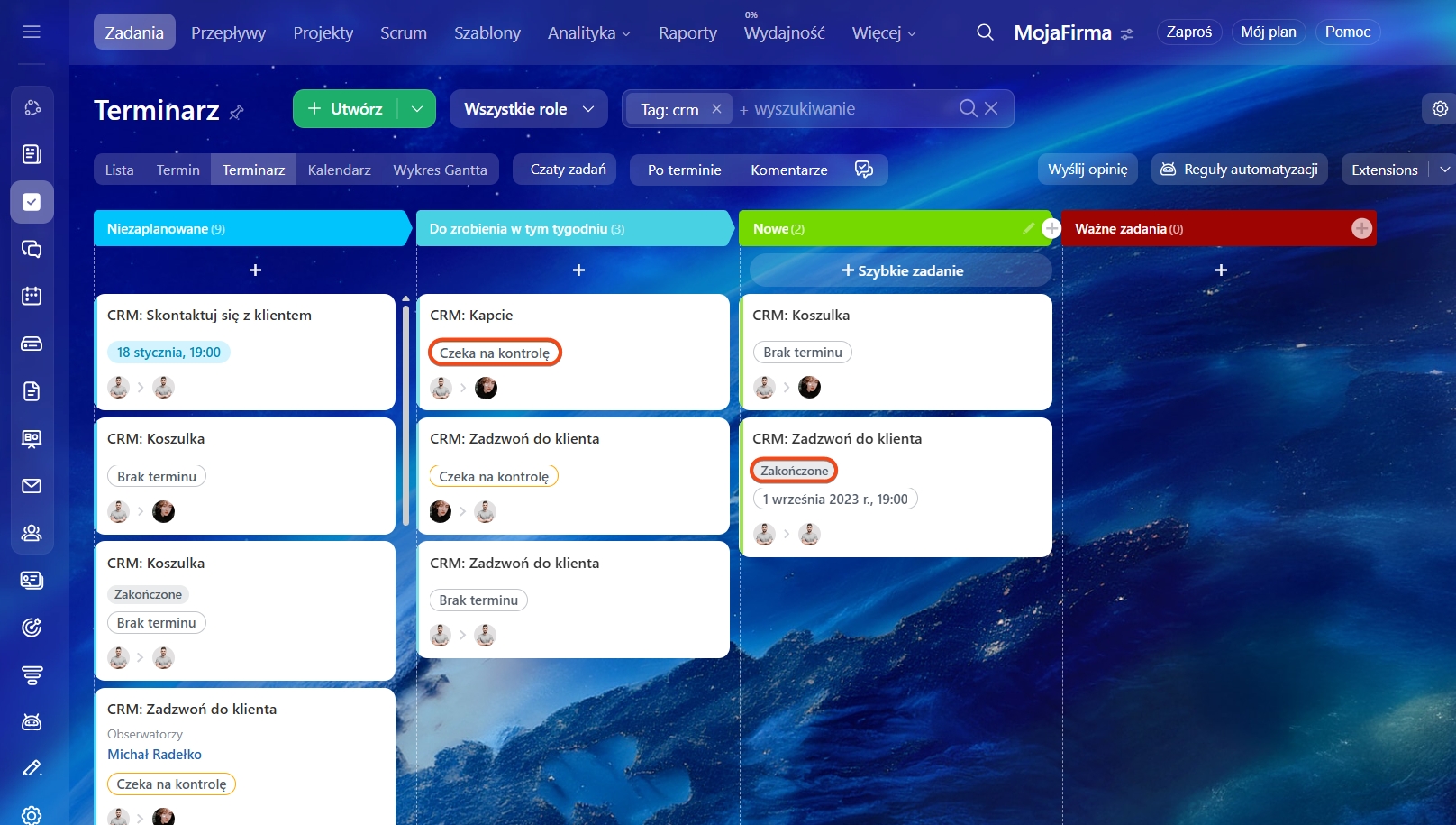 Zadania mają statusy, które pomagają śledzić postępy i nie przegapić zmian. Status zadania można zobaczyć w kanbanie CRM.