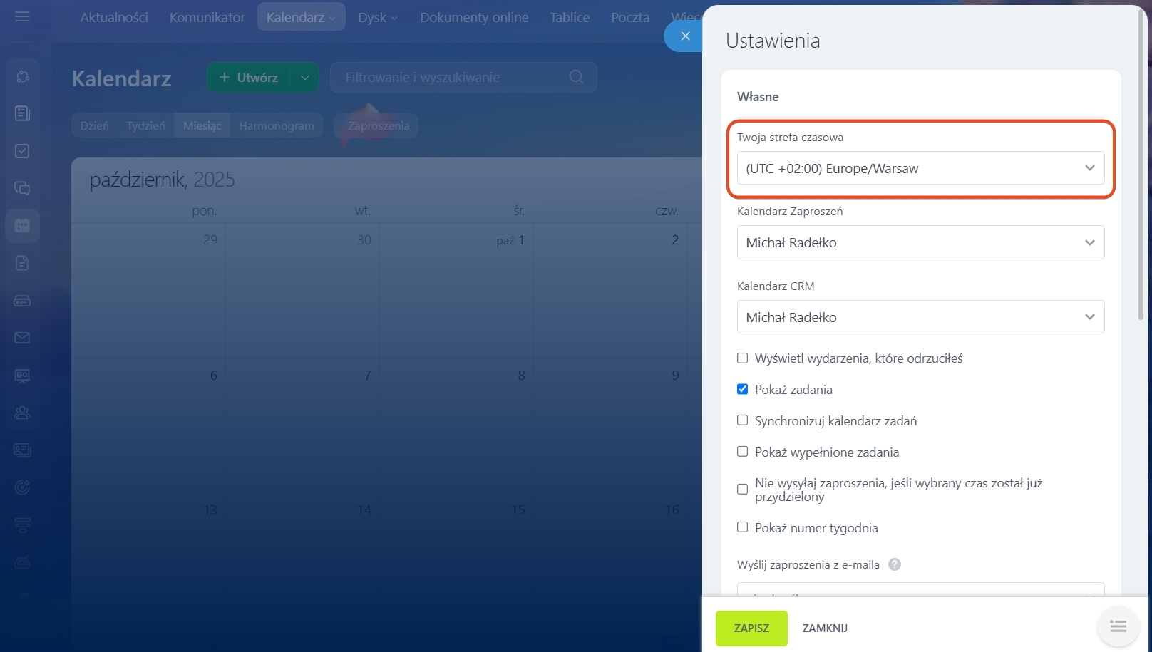 Kalendarz Bitrix24 automatycznie dostosowuje czas do strefy czasowej pracownika.