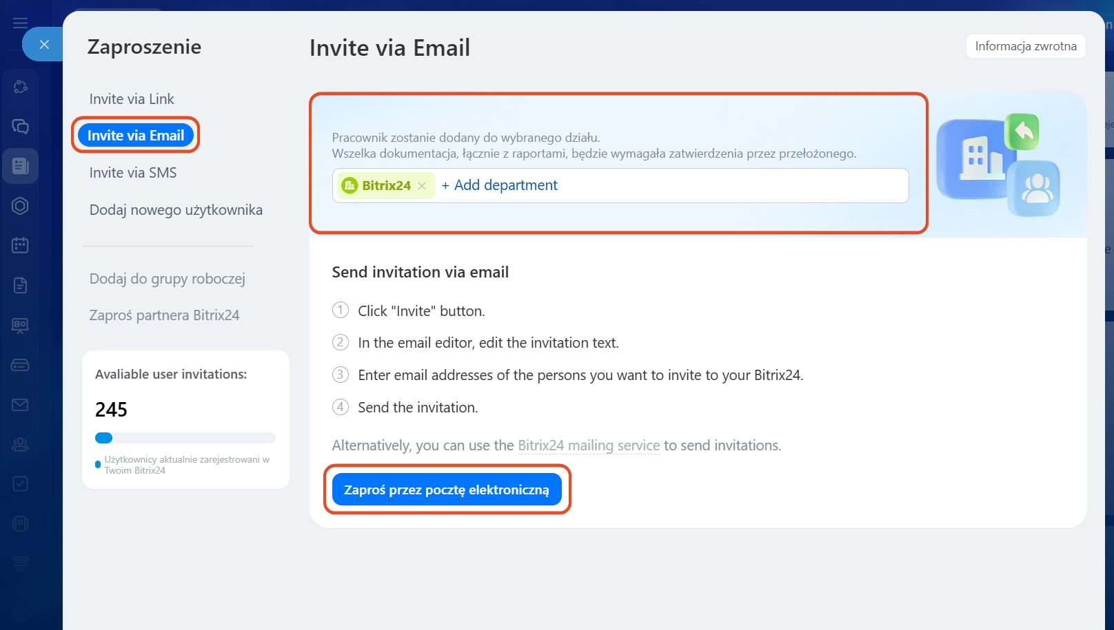 - W Bitrix24 możesz zaprosić pracowników za pomocą poczty elektronicznej — przez aplikację pocztową lub serwis pocztowy Bitrix24