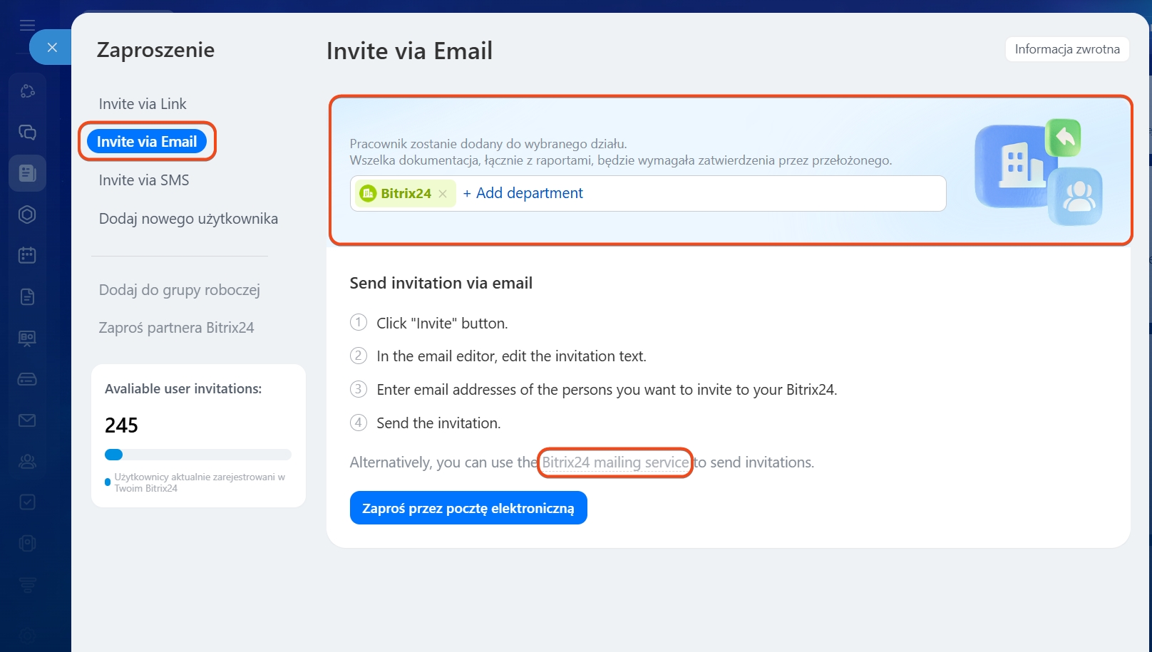 2-3. Wybierz Zaproszenie przez e-mail i kliknij Usługi poczty elektronicznej Bitrix24.
