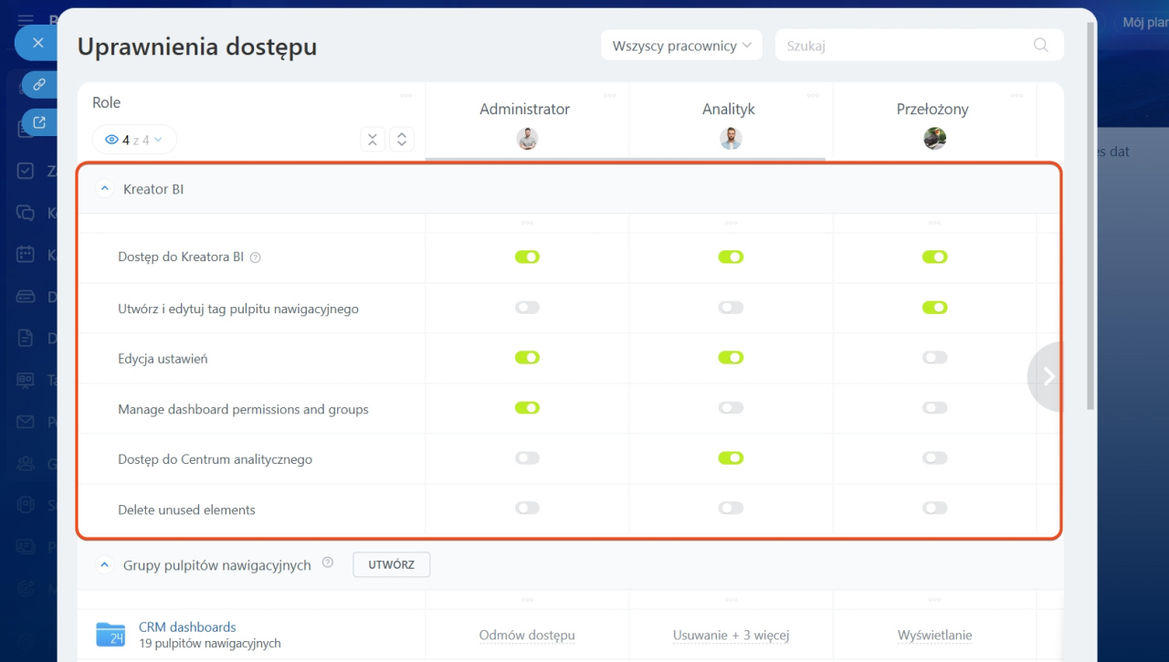- W Kreatorze BI możesz skonfigurować, kto i jak będzie pracować z raportami. Przypisz role pracownikom, określ, kto może przeglądać, edytować lub usuwać raporty.