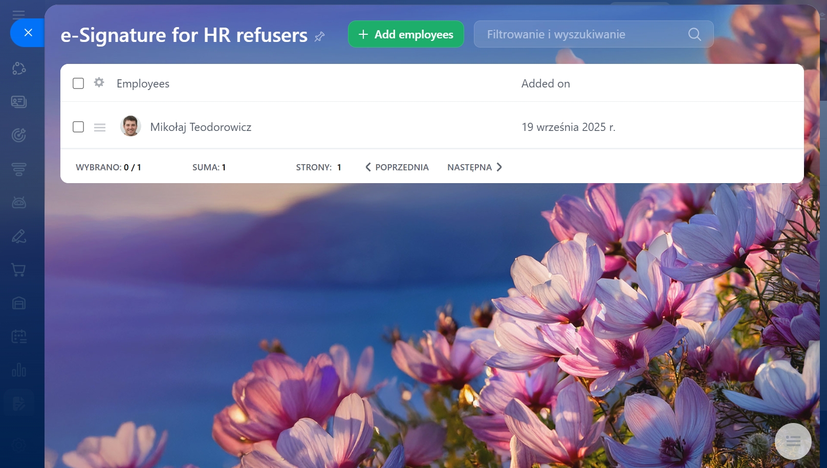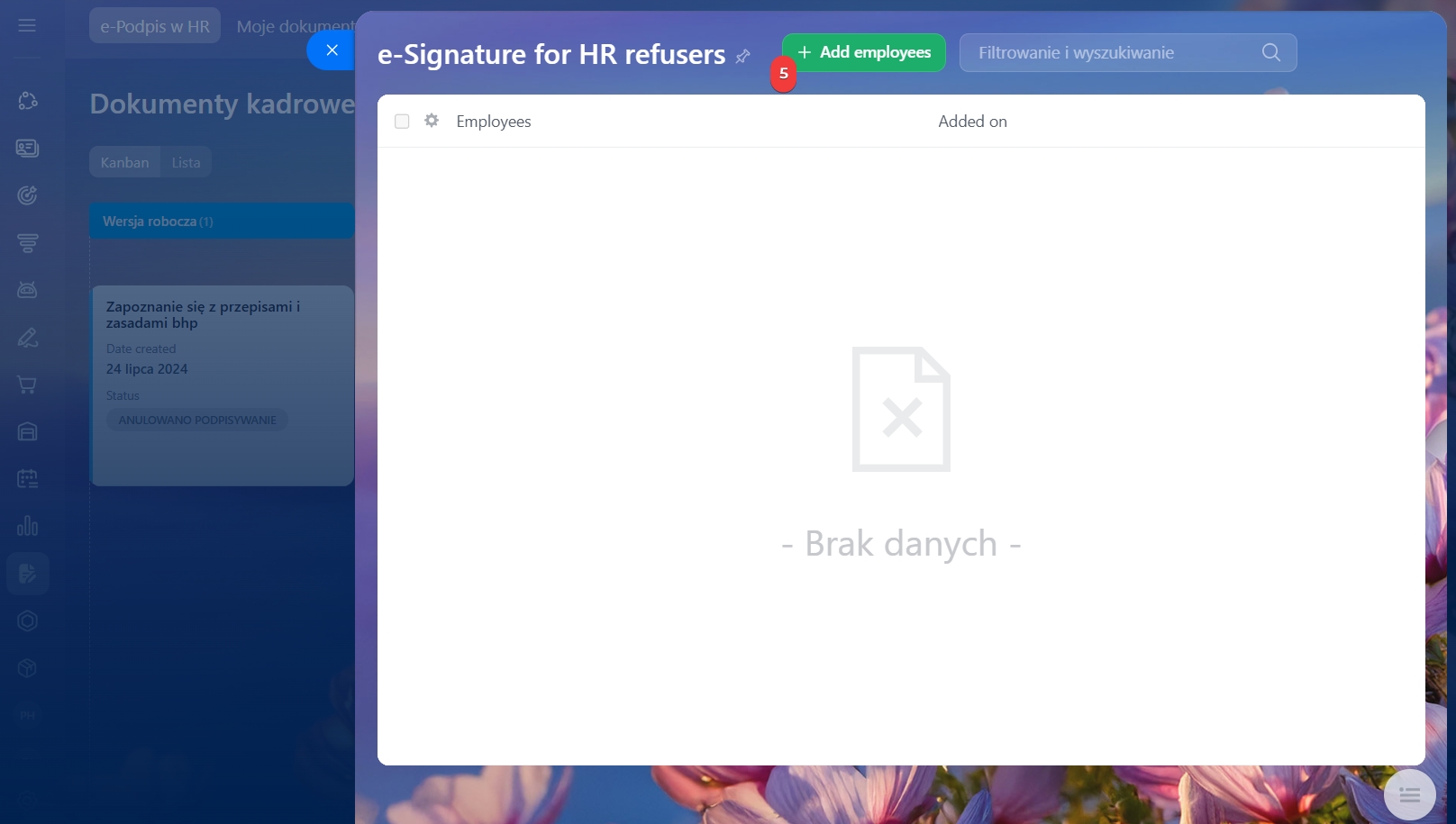 - Aby utworzyć listę, przejdź do sekcji e-Podpis w HR > Więcej > Pracownicy > Zrezygnowali z e-Podpisu.