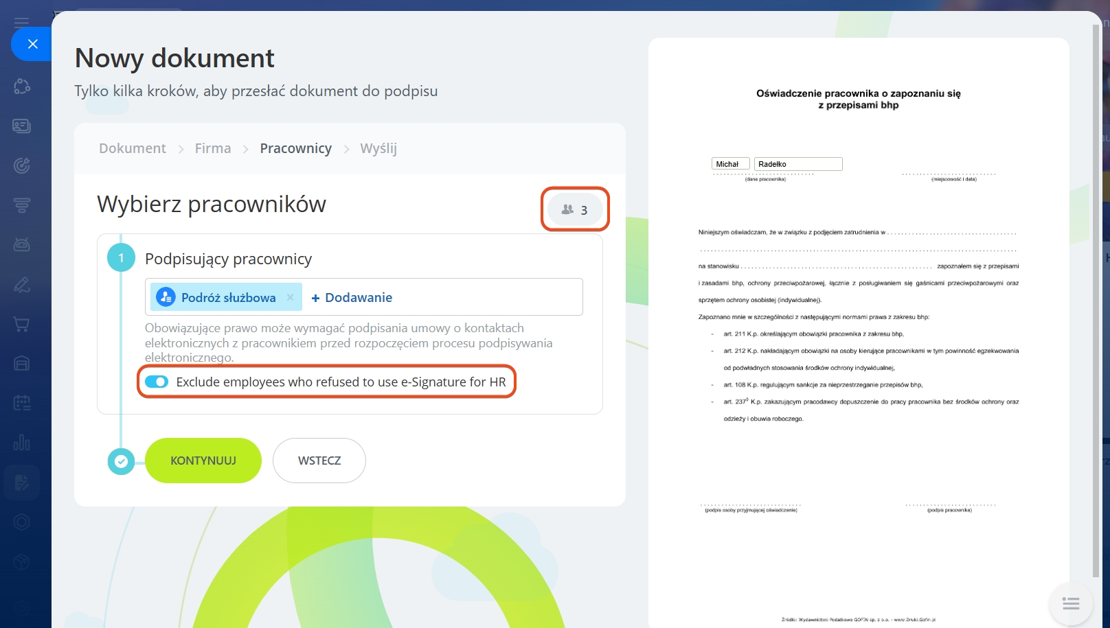 Podczas wysyłki dokumentu do podpisu, na etapie wyboru pracowników, dostępna jest opcja Wyklucz pracowników preferujących tradycyjne podpisywanie. Jest ona domyślnie włączona, więc polecenie trafi tylko do trzech pracowników, a osoba preferująca formę papierową nie otrzyma dokumentu.