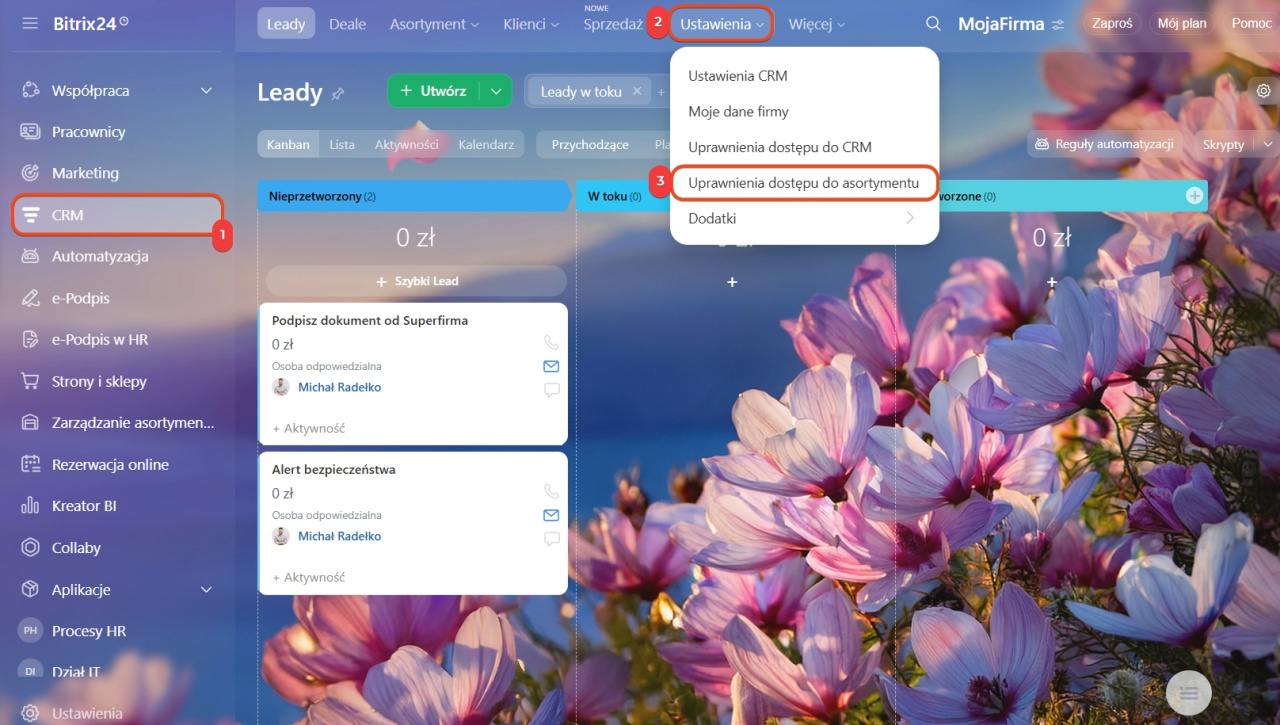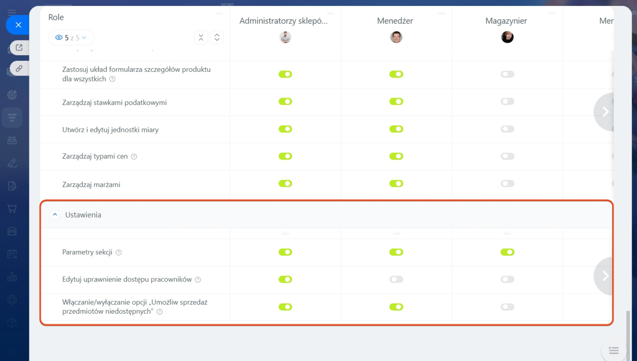 Przejdź do sekcji CRM > Ustawienia > Uprawnienia dostępu do asortymentu. Aby pracownicy mogli zmieniać parametry katalogu, zarządzać uprawnieniami dostępu oraz zezwalać na sprzedaż niedostępnych produktów, przyznaj im następujące uprawnienia: