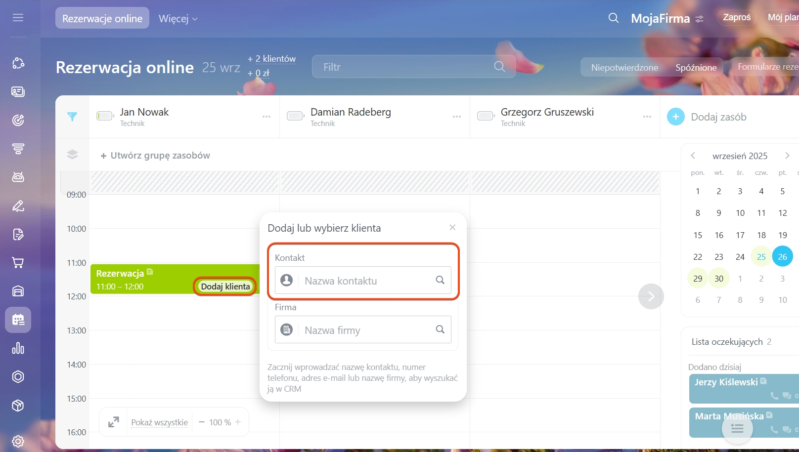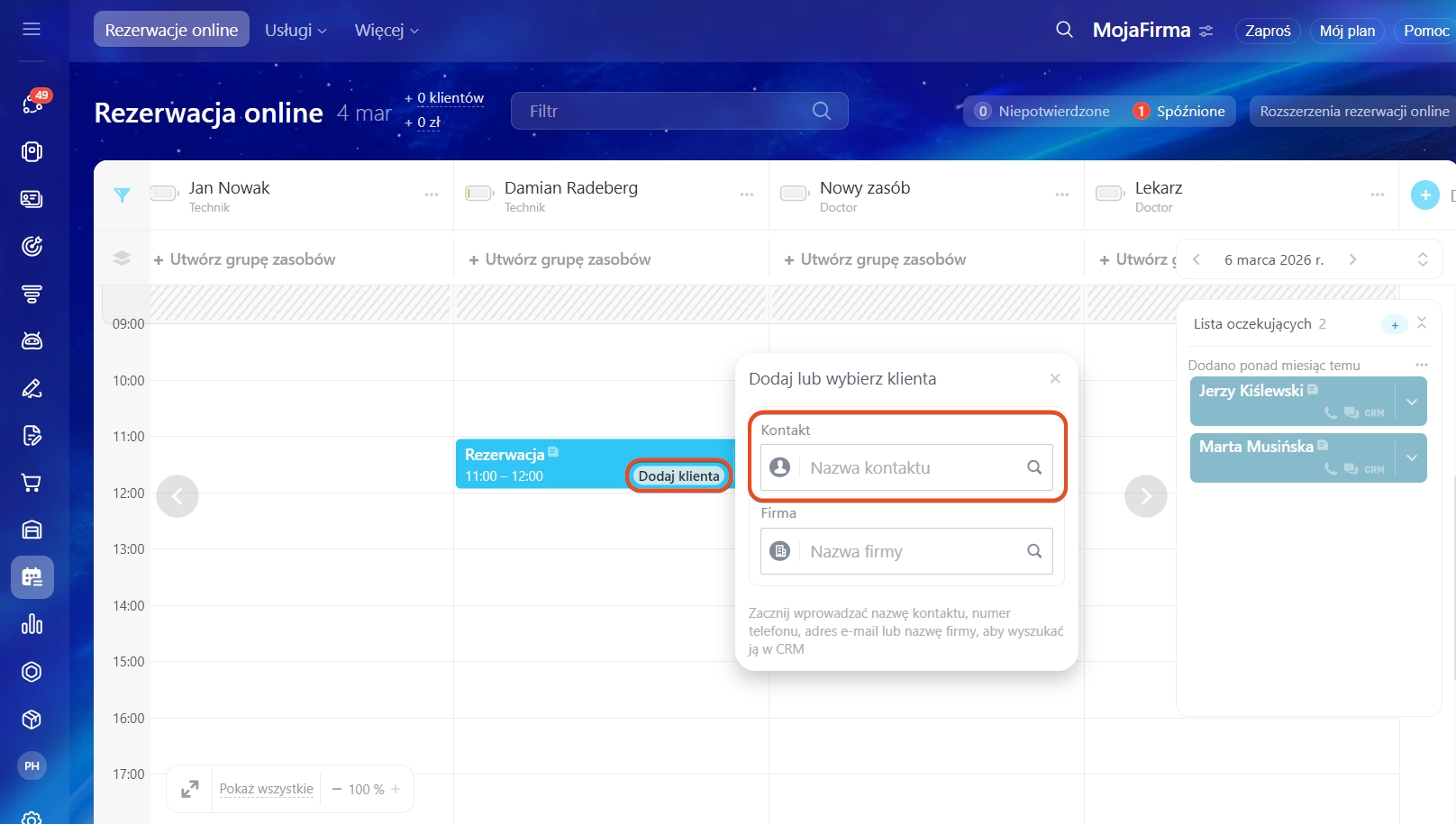 W sekcji Rezerwacja online. Przy tworzeniu nowej rezerwacji kliknij Klient. W polu Imię kontaktu zacznij wpisywać imię klienta i wybierz je z listy. Rezerwacja automatycznie połączy się z CRM i wyświetli w formularzu.