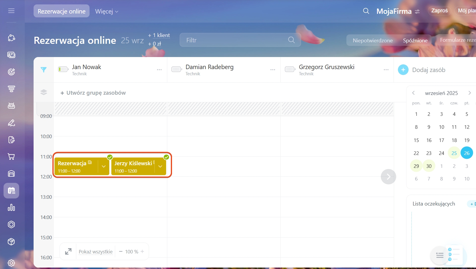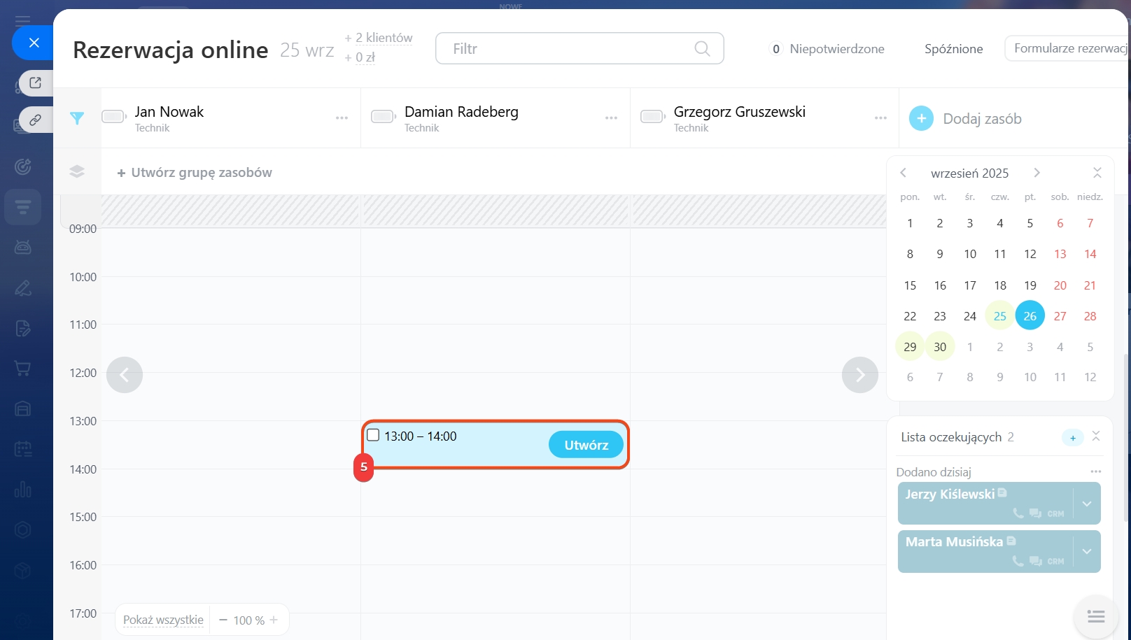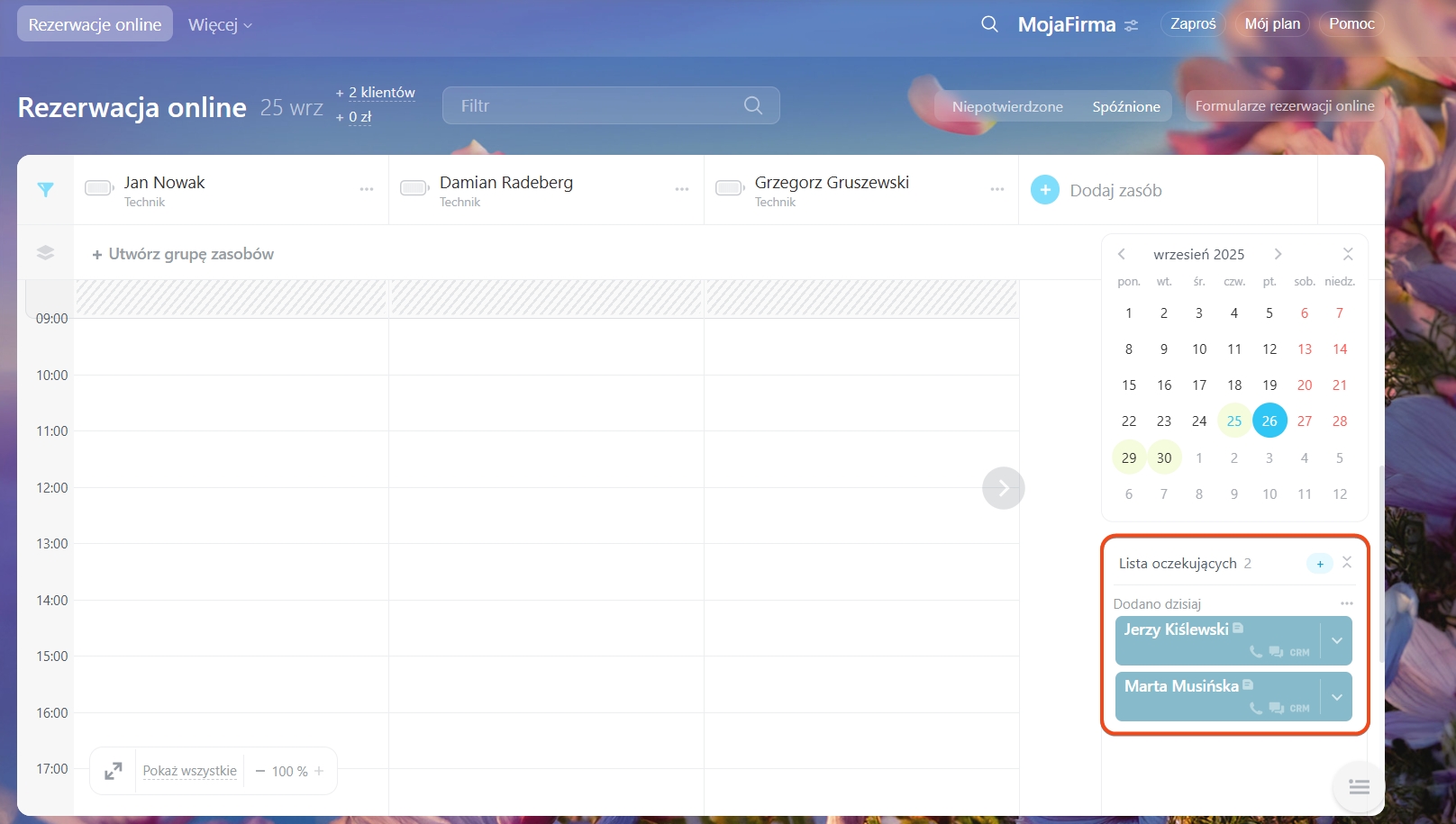 Jeśli wszystkie terminy są zajęte, można dodać klienta do listy oczekujących. W przypadku odwołania rezerwacji system automatycznie informuje menedżera, który może zaproponować zwolniony termin osobom z listy.