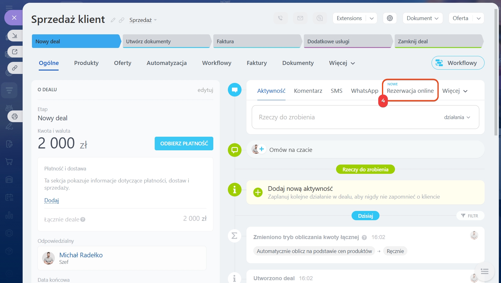 W formularzu elementu CRM. Przejdź do sekcji CRM i wybierz odpowiedni element, na przykład kontakt lub deala. Na osi czasu kliknij Rezerwacja online i wybierz termin dla odpowiedniego zasobu.