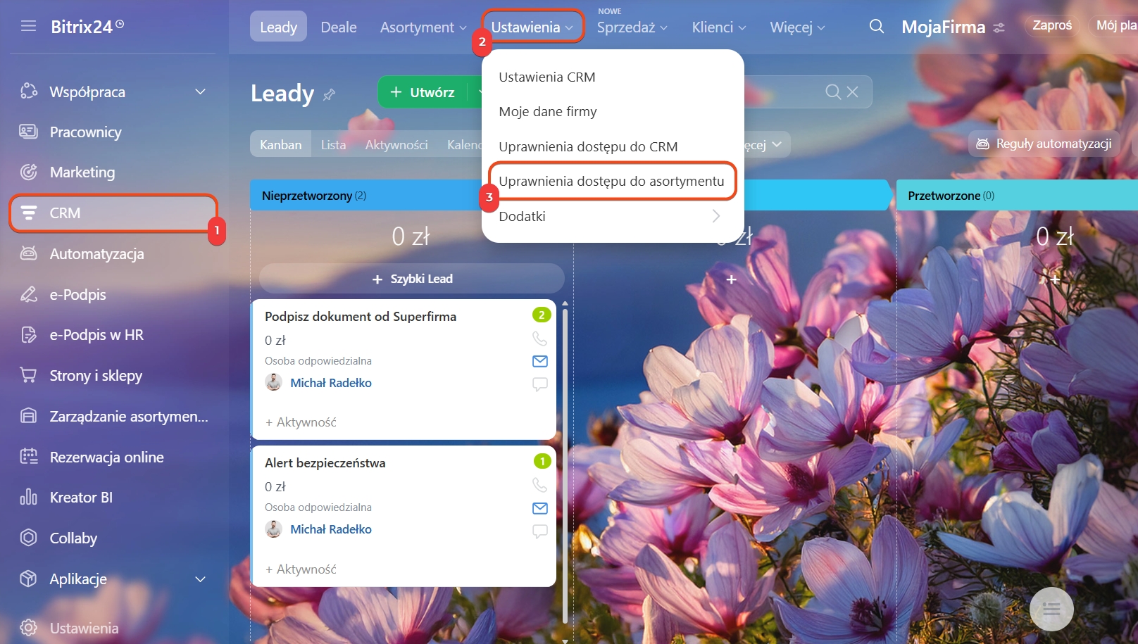 Domyślnie uprawnienia dostępu mogą być konfigurowane przez administratora Bitrix24, ale może on przekazać te prawa innym pracownikom. Aby skonfigurować uprawnienia, otwórz