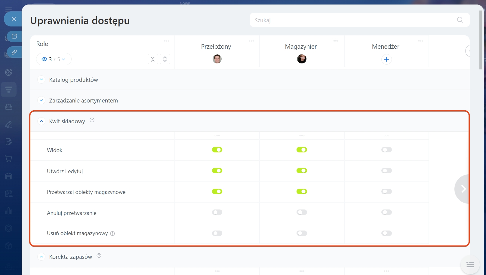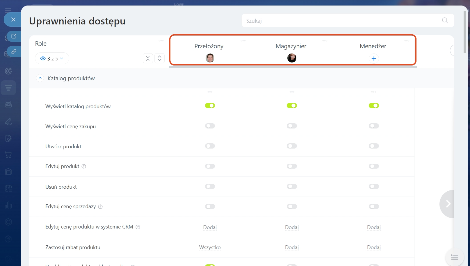 Dostęp jest przypisywany według ról. Możesz użyć standardowych ról — dodać pracowników i skonfigurować uprawnienia za pomocą przełączników. Dostępne są trzy role: