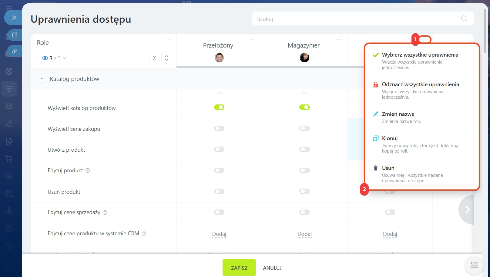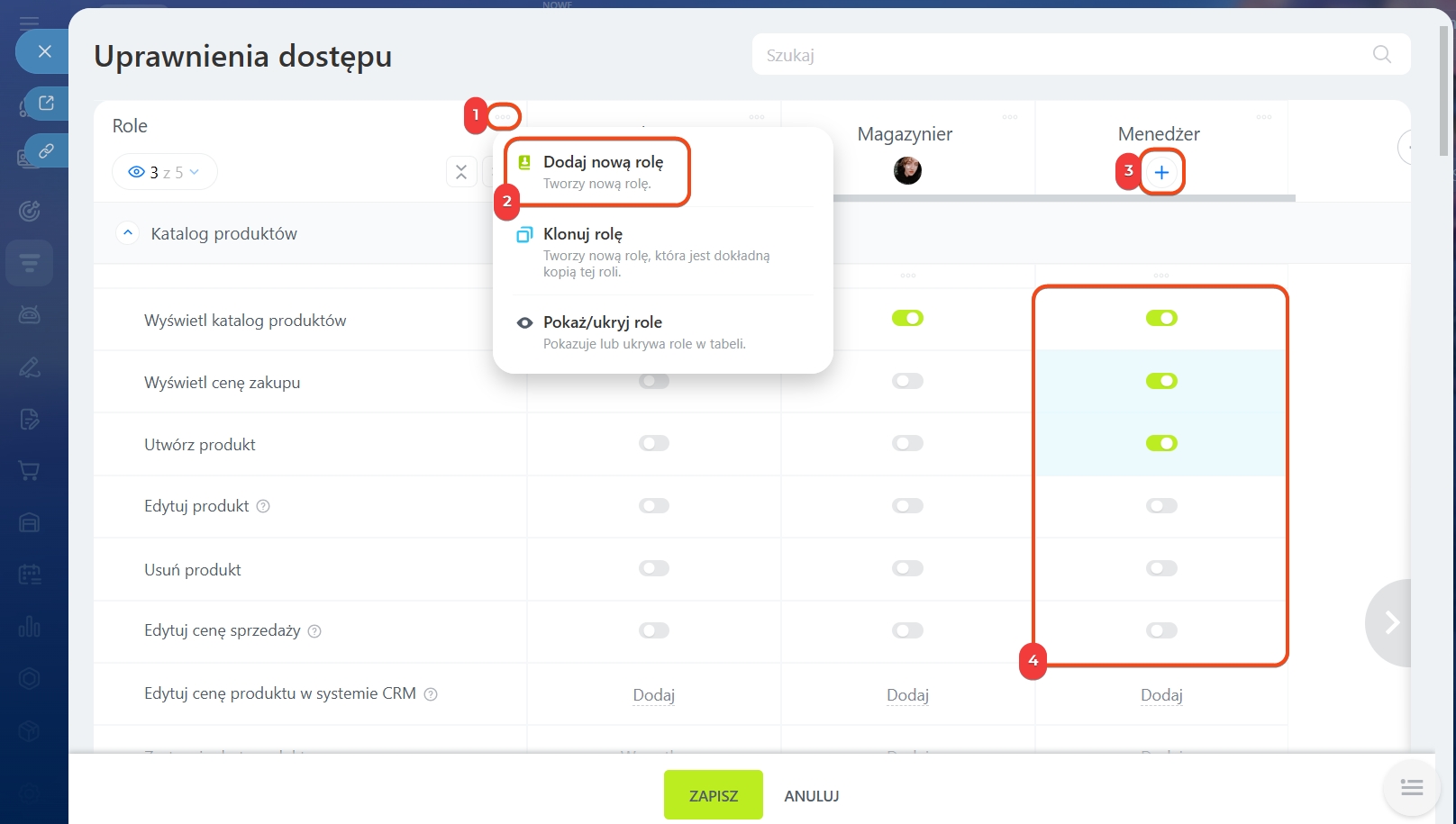 - Dla każdej roli wybierasz, jakie działania będą dostępne: przegląd, tworzenie, edytowanie, usuwanie i inne.