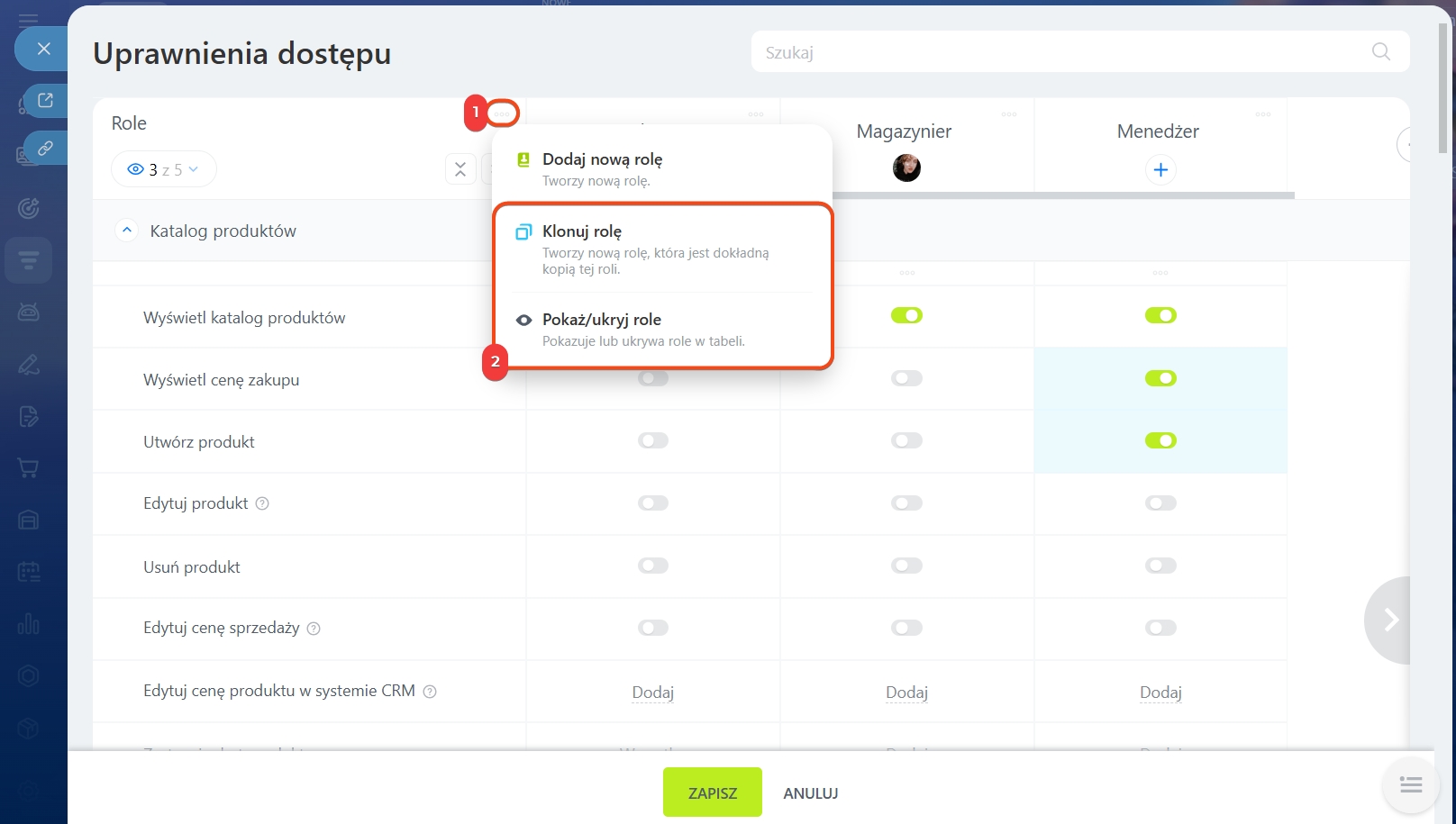 Możesz skopiować skonfigurowane uprawnienia do nowej roli i zmienić kolejność wyświetlania ról.
