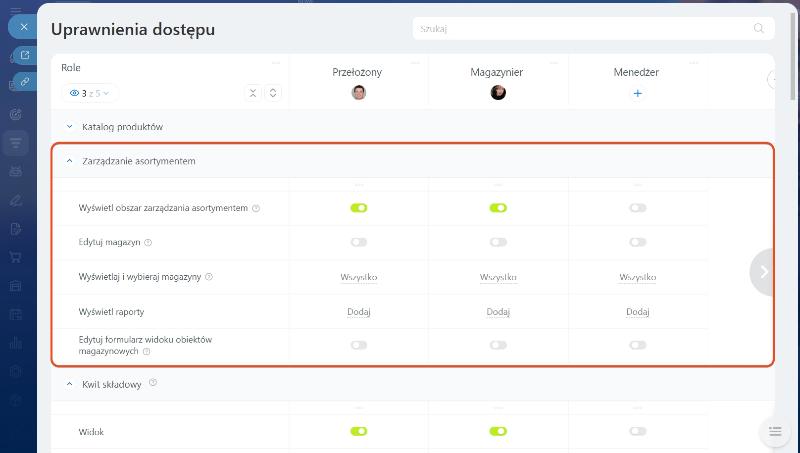 Zarządzanie Asortymentem. W tym bloku możesz skonfigurować dostęp do sekcji i operacji magazynowych. Uprawnienia zazwyczaj przydziela się menedżerom do pracy z dokumentami, a kierownikom do ustawień i raportów.