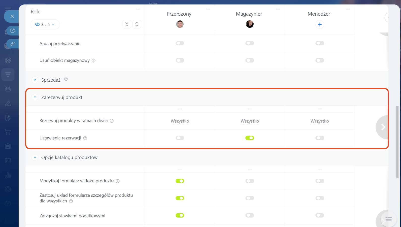 Rezerwacja produktów. W tym bloku możesz skonfigurować, którzy pracownicy będą mogli rezerwować produkty i zarządzać trybami rezerwacji. Na przykład menedżer może „zarezerwować” potrzebne pozycje do daty wysyłki, aby nie zostały sprzedane innemu klientowi.