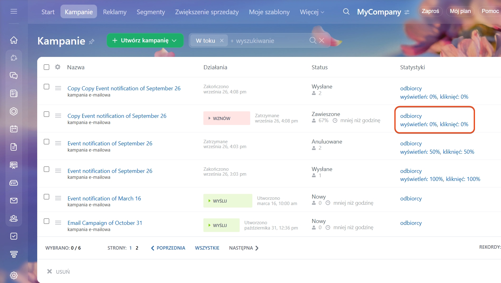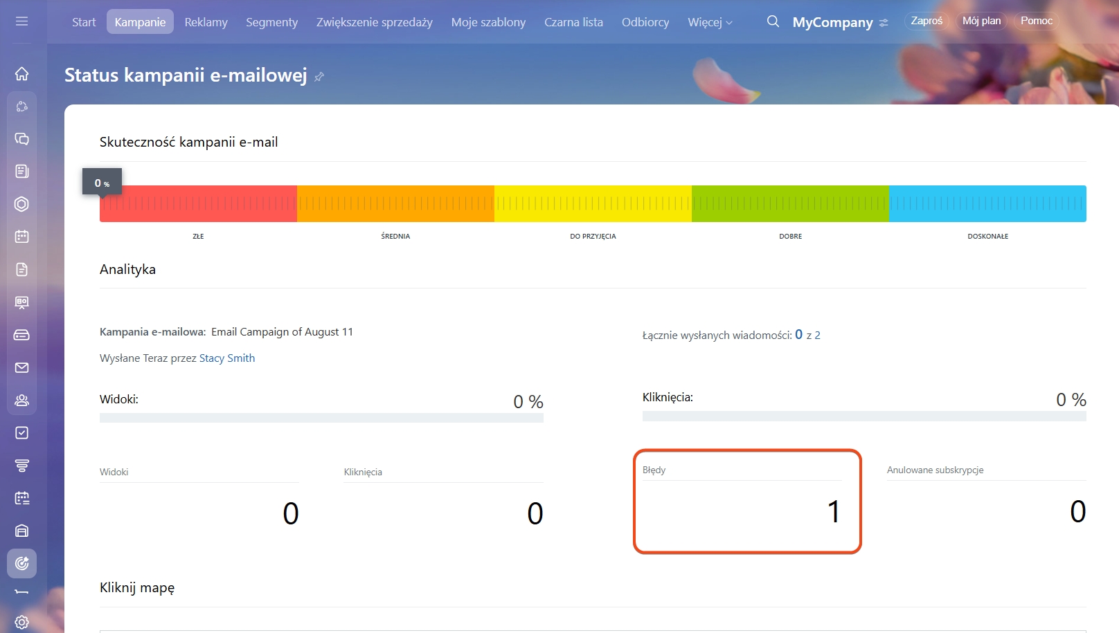 Przejdź do sekcji Marketing i otwórz zakładkę Kampanie. Kliknij statystyki kampanii, aby zobaczyć e-maile oznaczone statusem Błędy.
